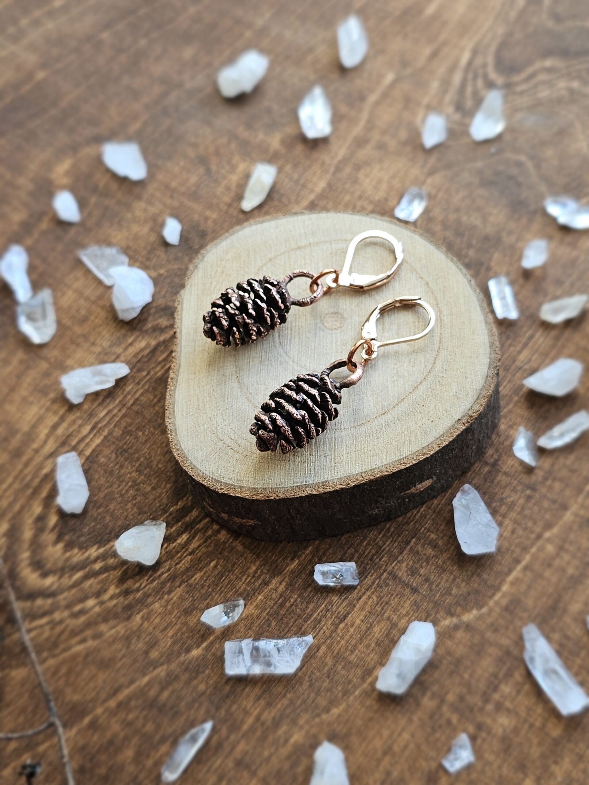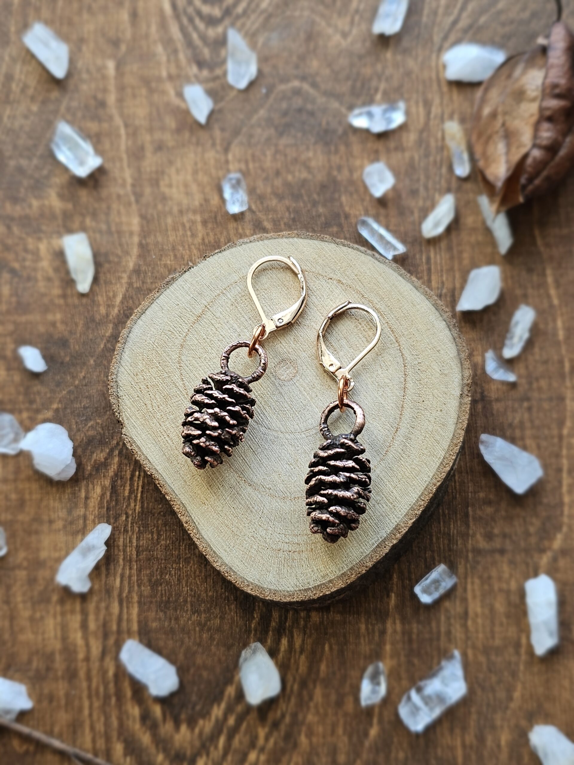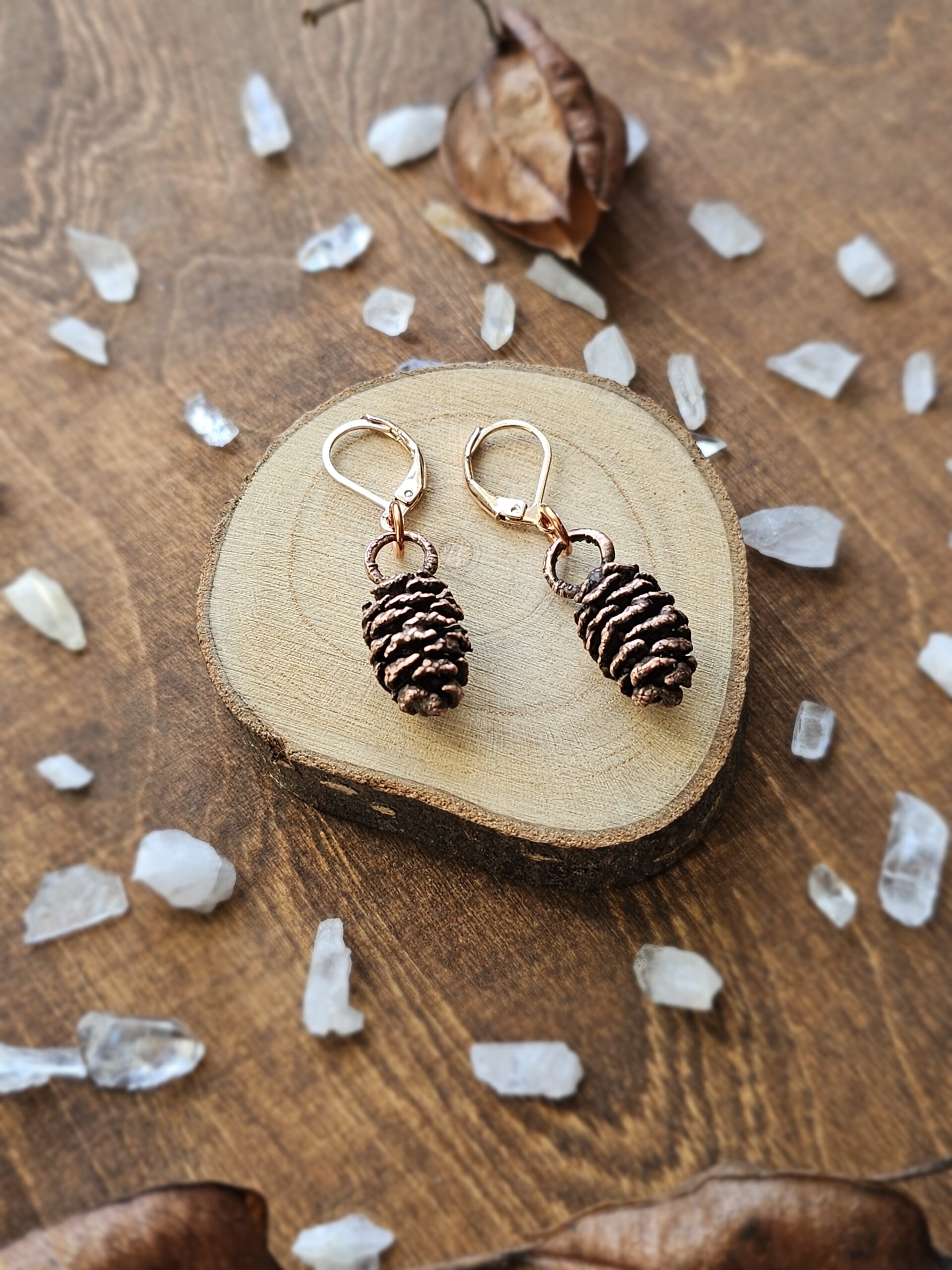 Ręcznie tworzone miedziane kolczyki. W środku znajdują się prawdziwe szyszki, które zostały utrwalone miedzią.