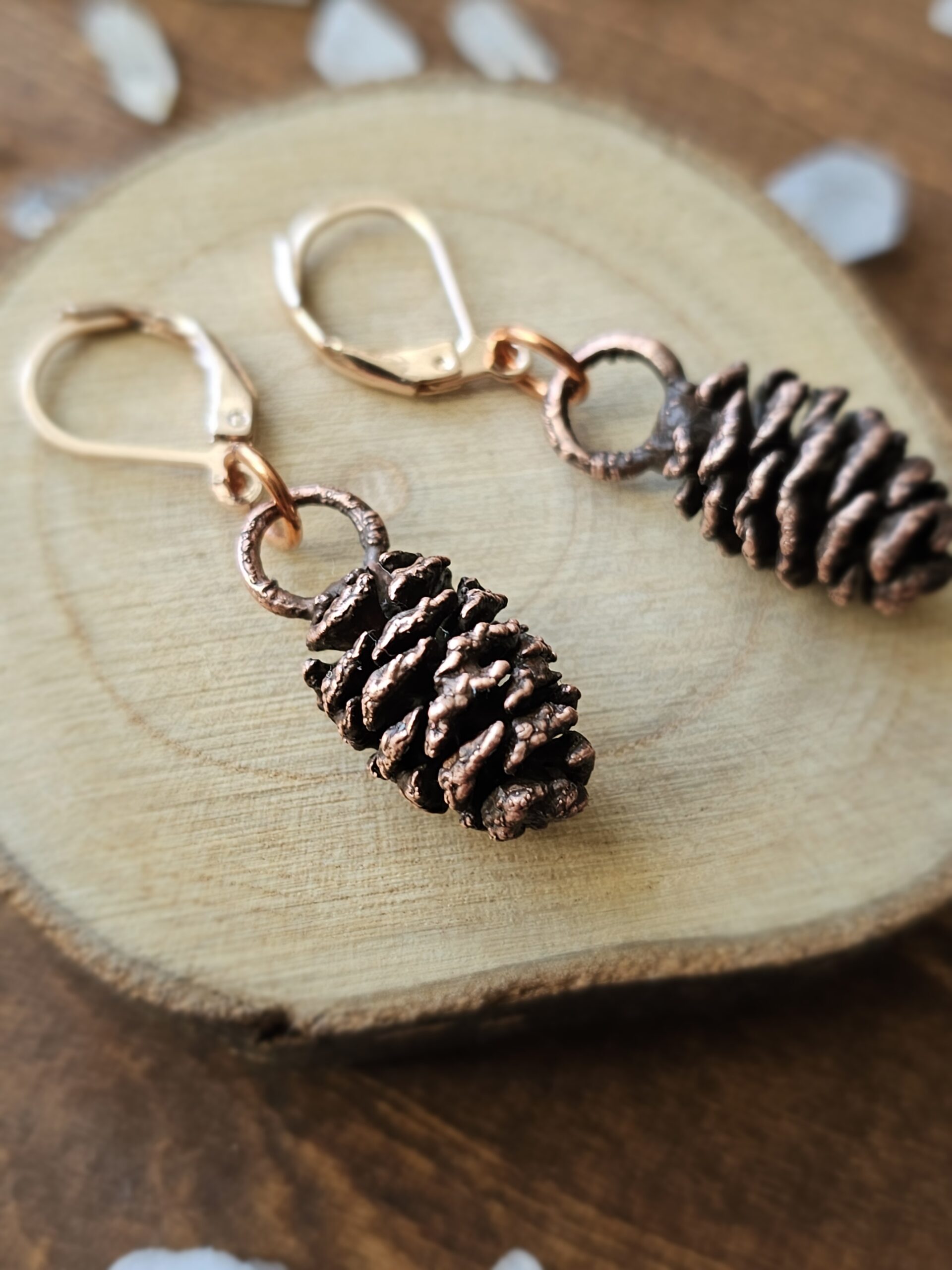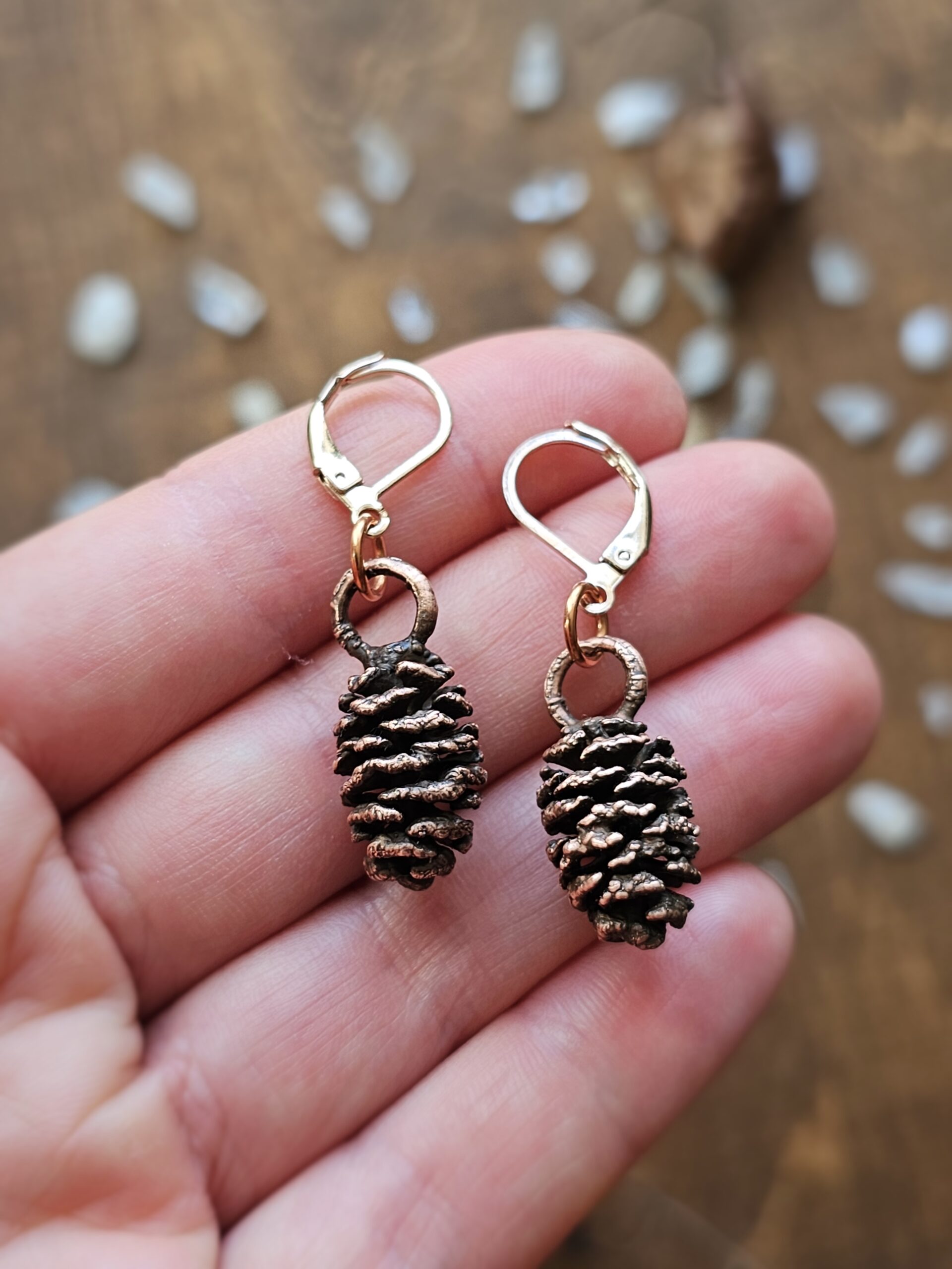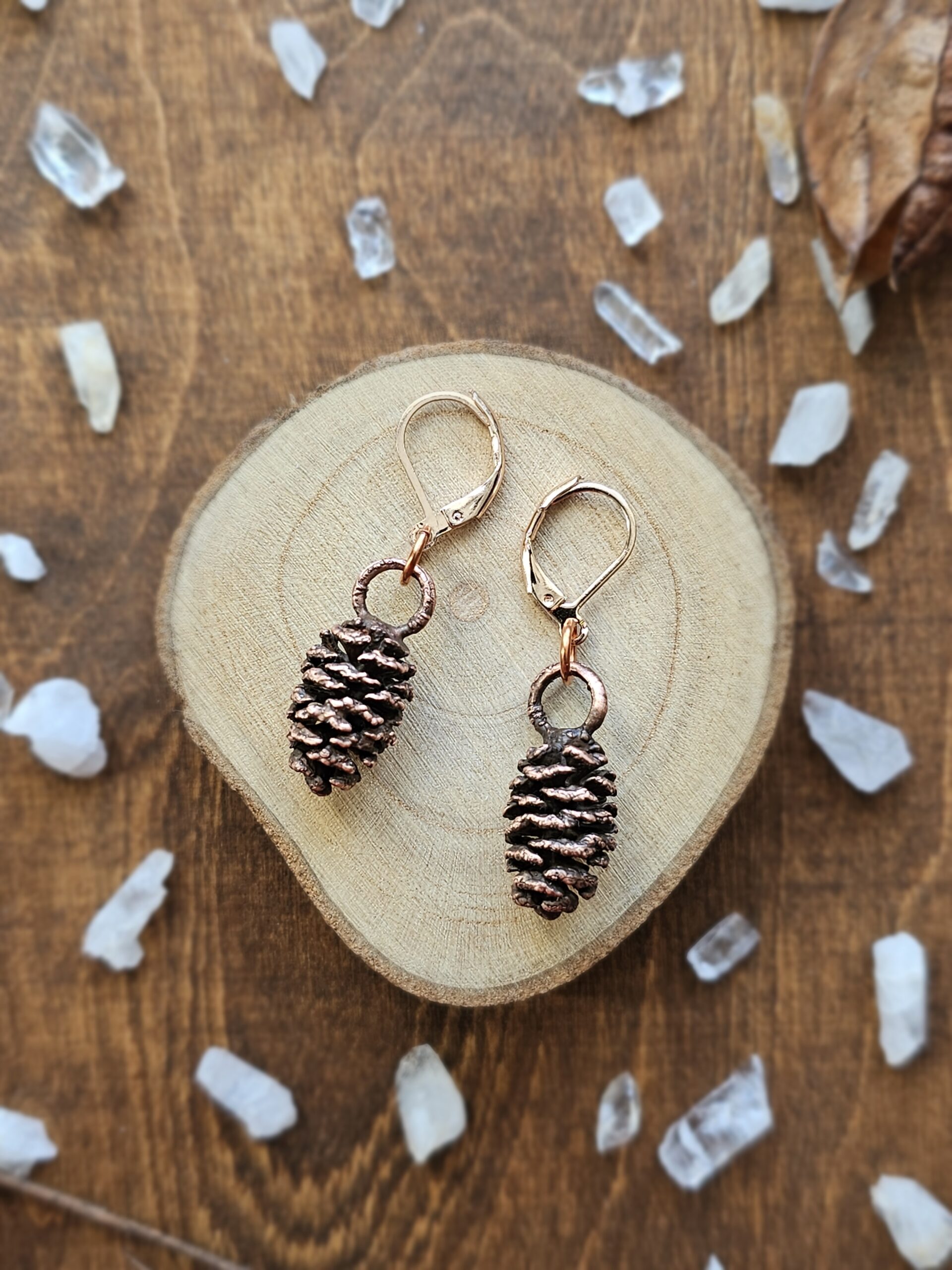 Ręcznie tworzone miedziane kolczyki. W środku znajdują się prawdziwe szyszki, które zostały utrwalone miedzią.