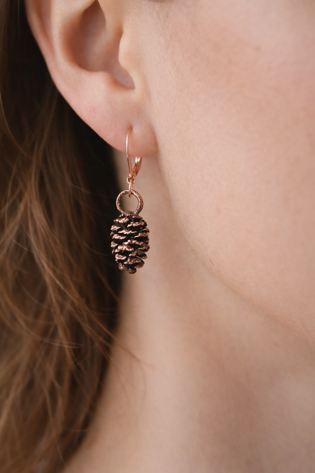 Kolczyki zostały stworzone własnoręcznie czasochłonną techniką elektroformowania miedzi. W środku znajdują się prawdziwe szyszki czarnej olchy, które zostały utrwalone miedzią.