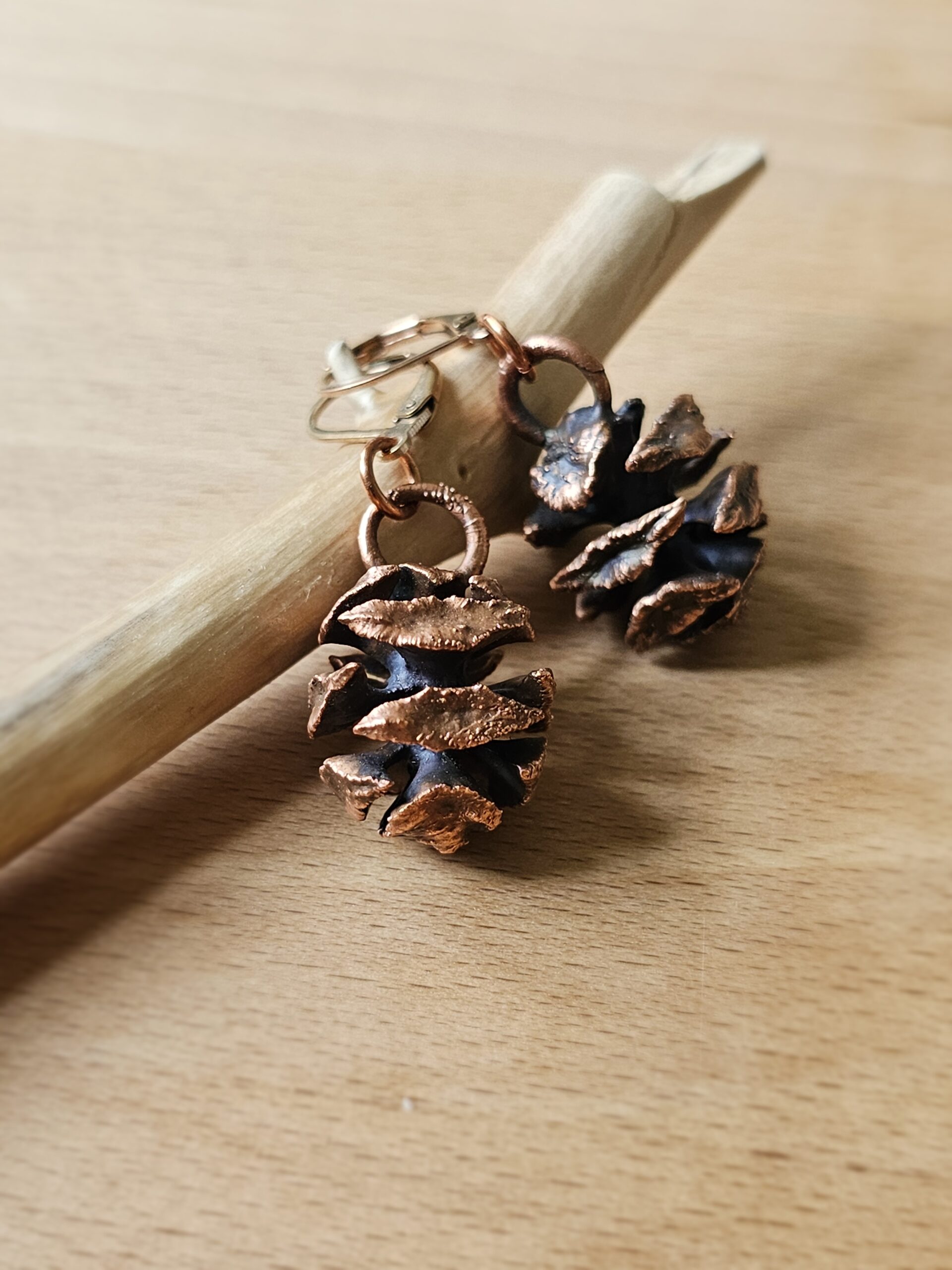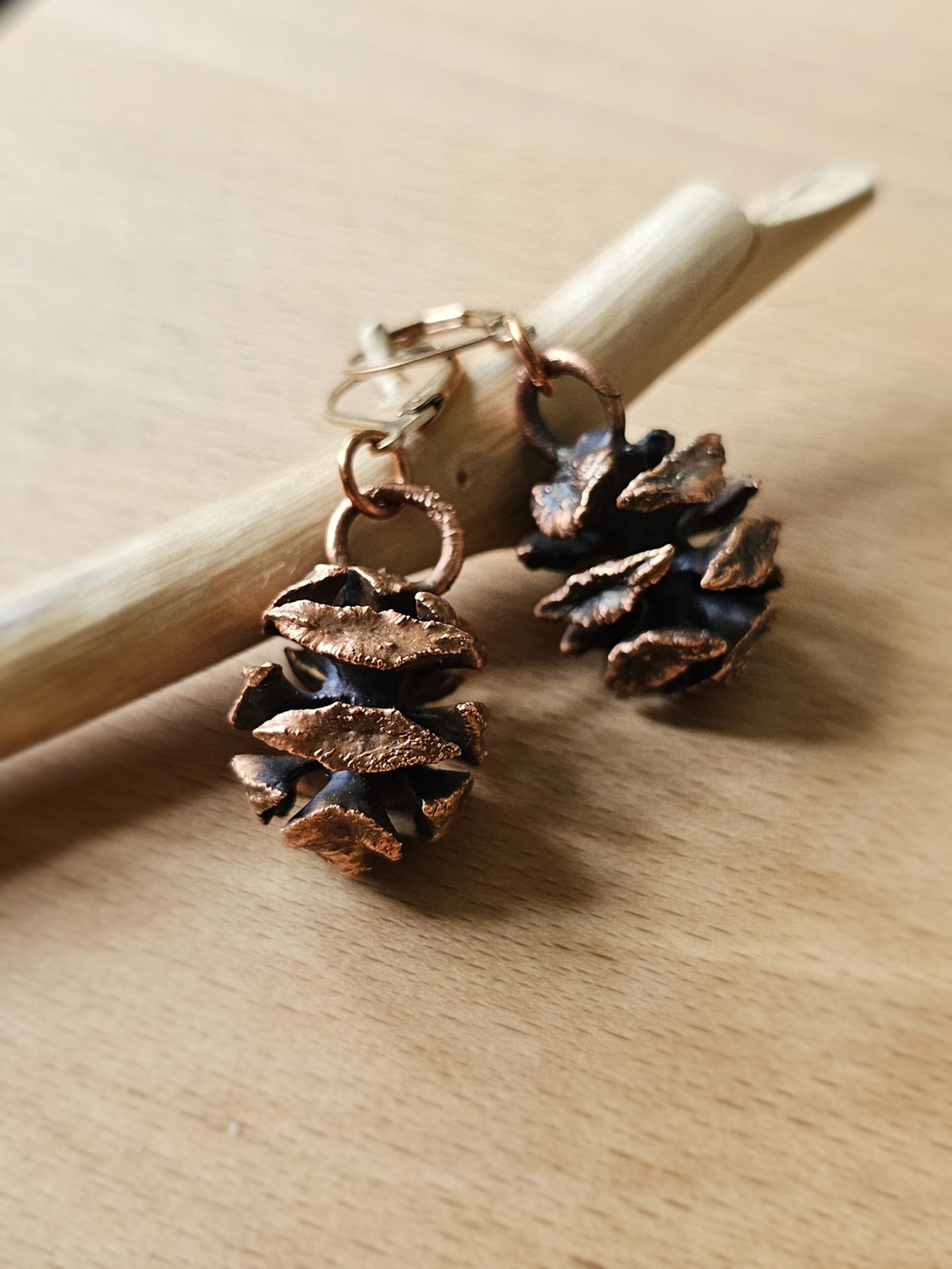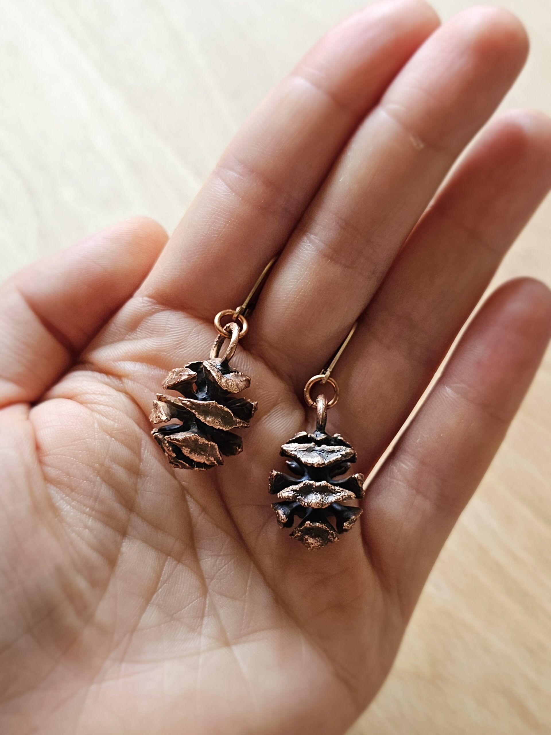 Kolczyki zostały stworzone własnoręcznie czasochłonną techniką elektroformowania miedzi. W środku znajdują się prawdziwe szyszki , które zostały utrwalone miedzią.