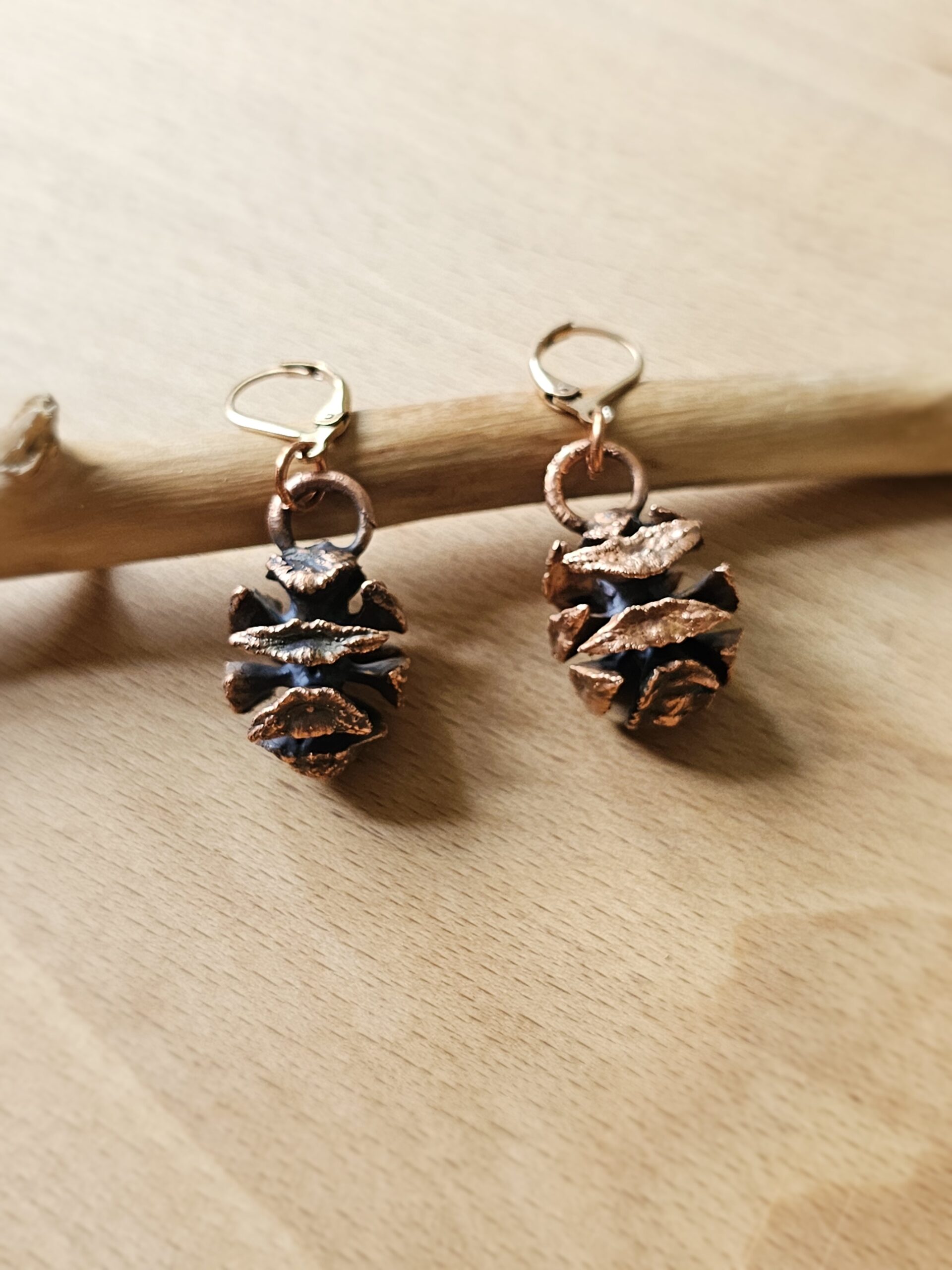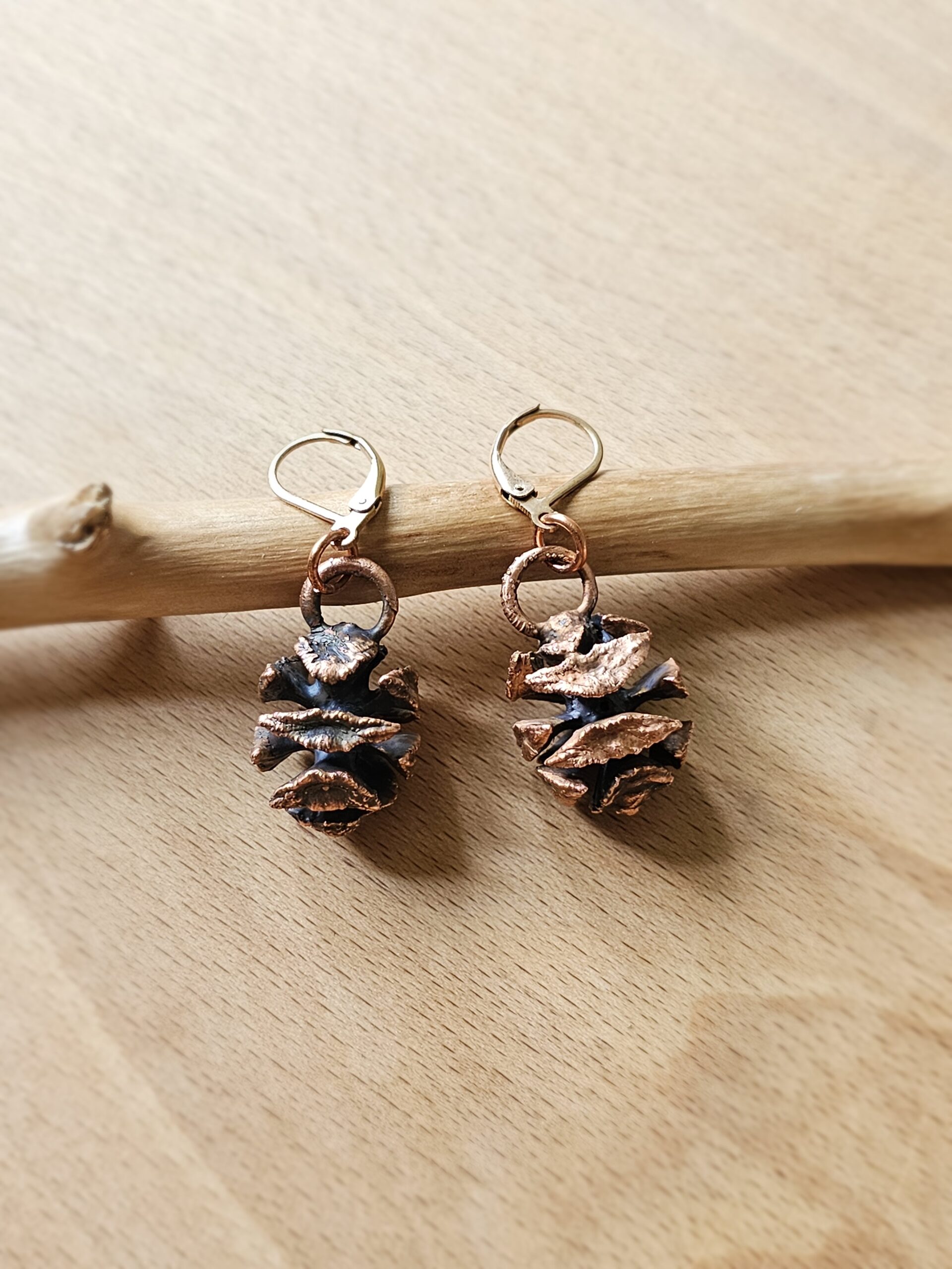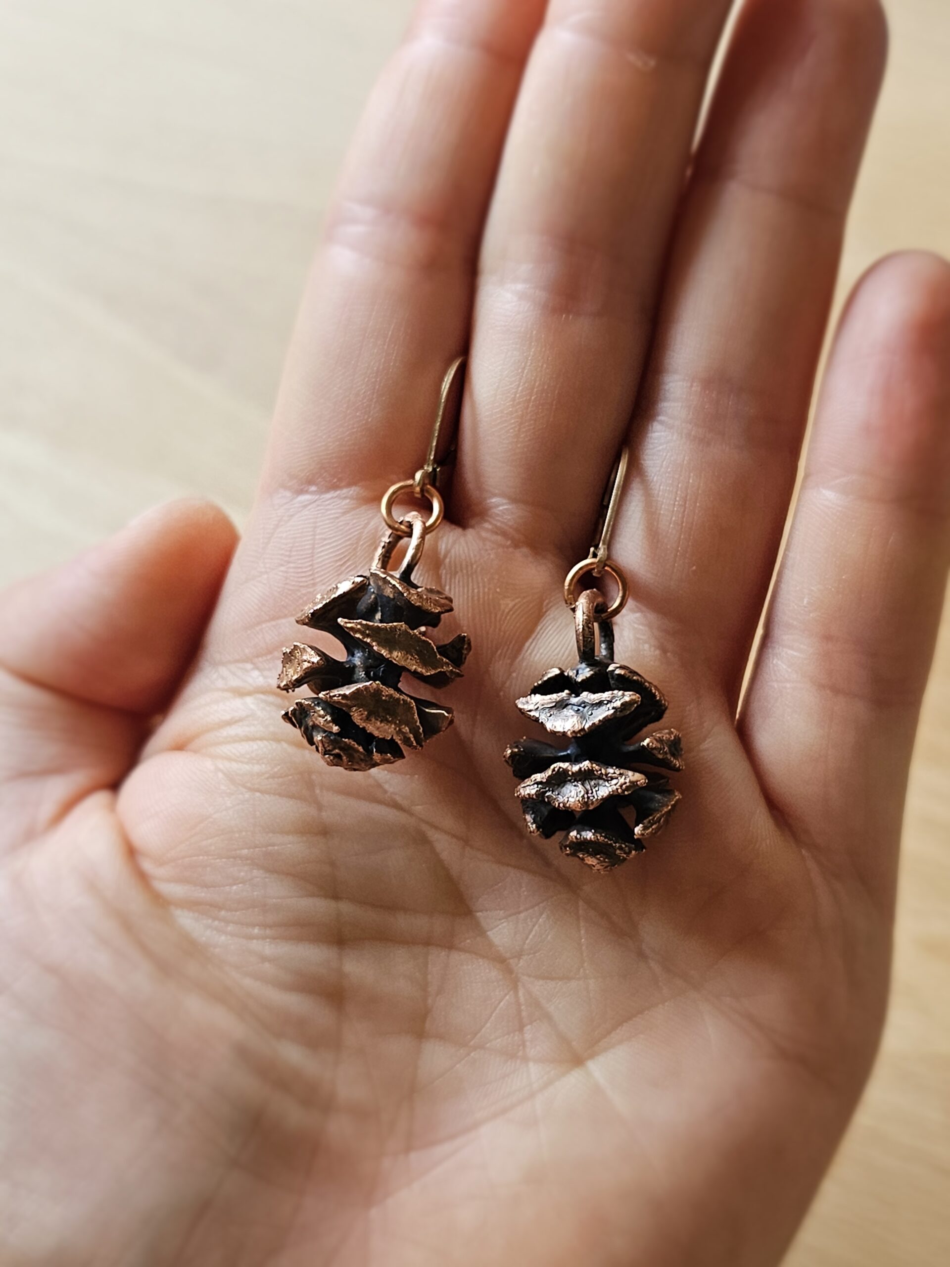 Kolczyki zostały stworzone własnoręcznie czasochłonną techniką elektroformowania miedzi. W środku znajdują się prawdziwe szyszki , które zostały utrwalone miedzią.