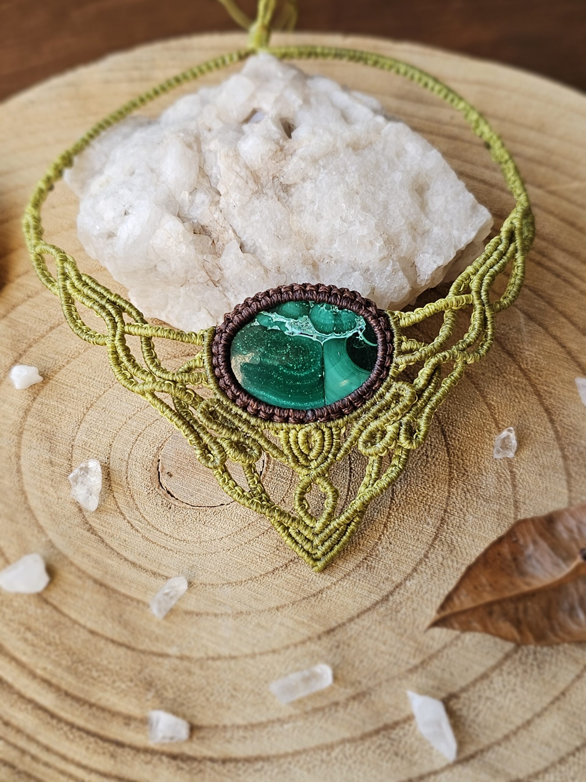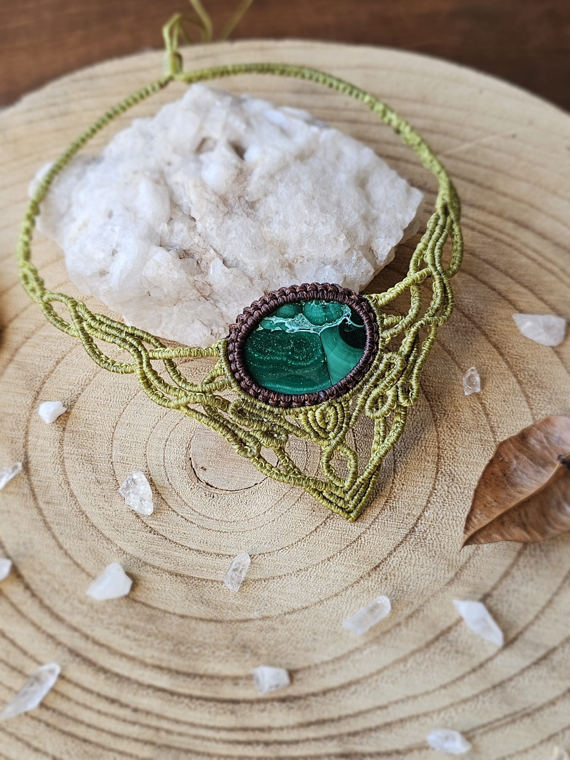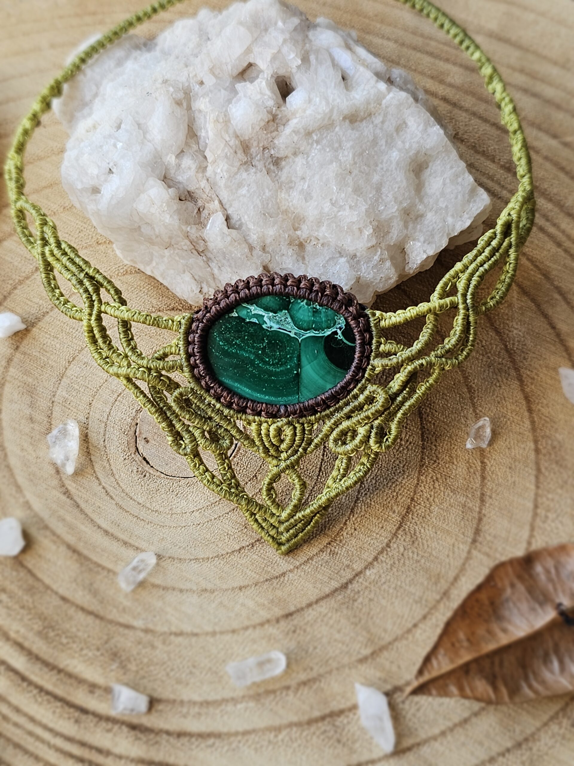 Kolia została wykonana ręcznie techniką micromacramy – precyzyjnego, czasochłonnego plecenia ze sznureczków, które tworzy subtelną, koronkową formę. W centrum kompozycji znajduje się naturalny minerał – Malachit.