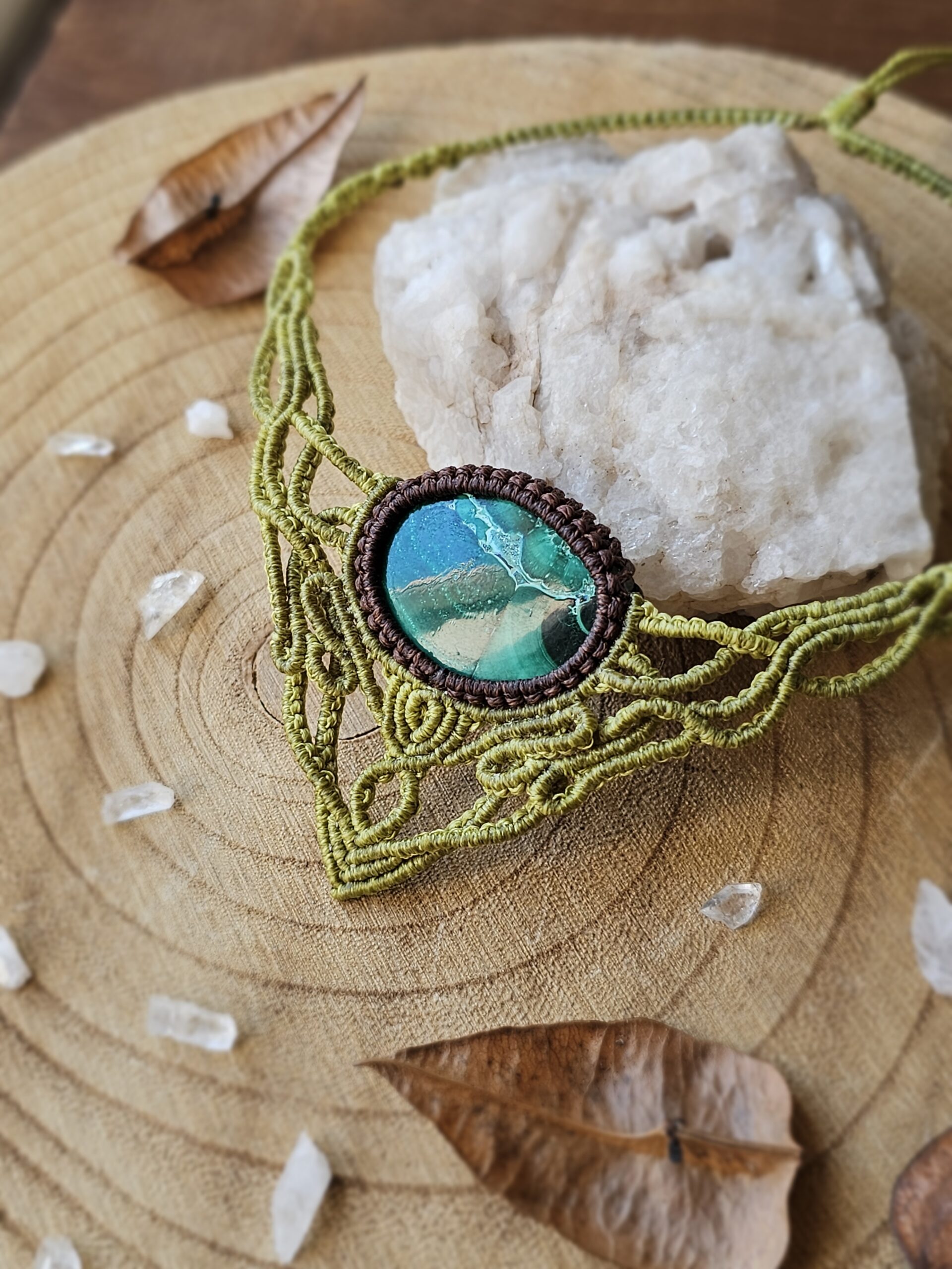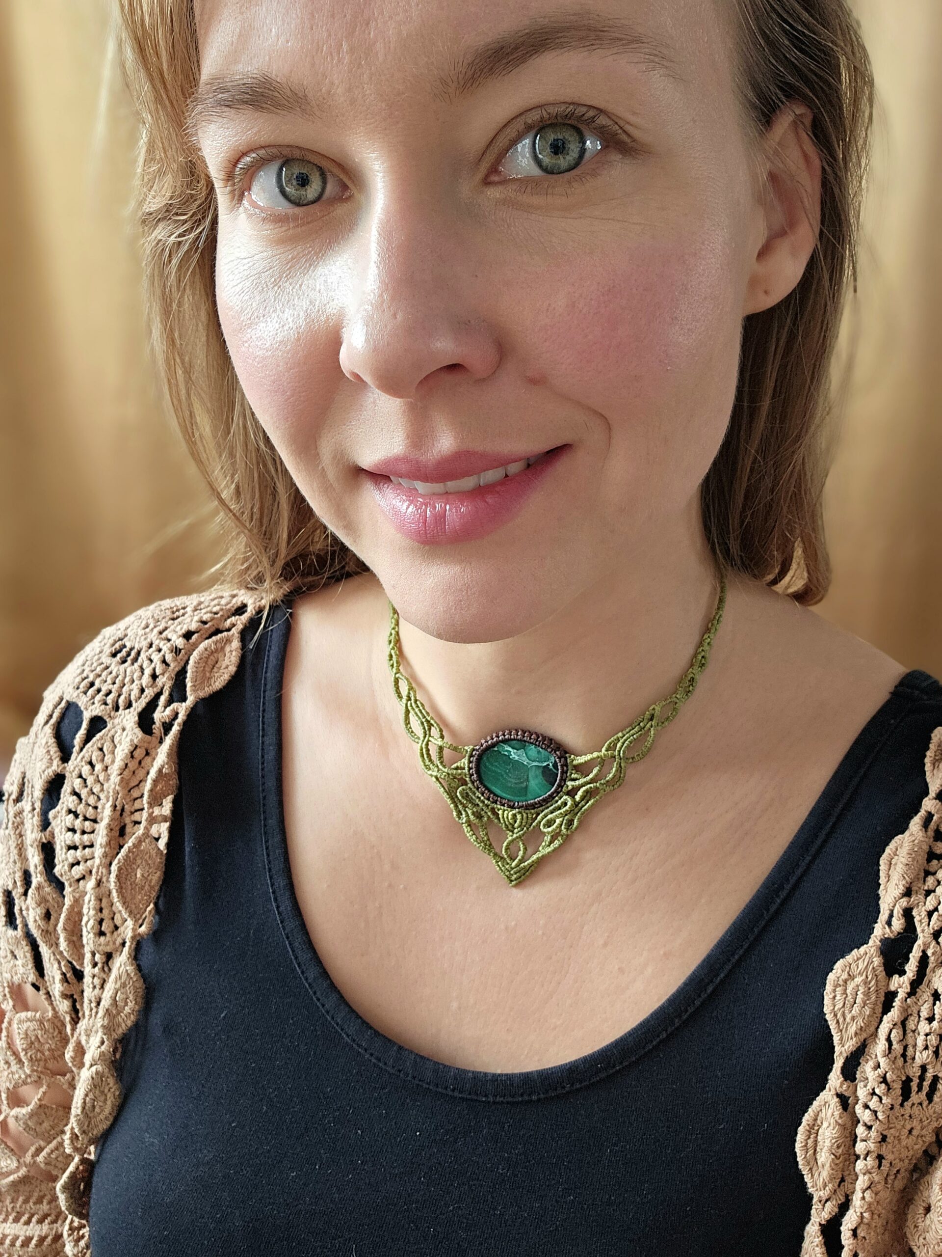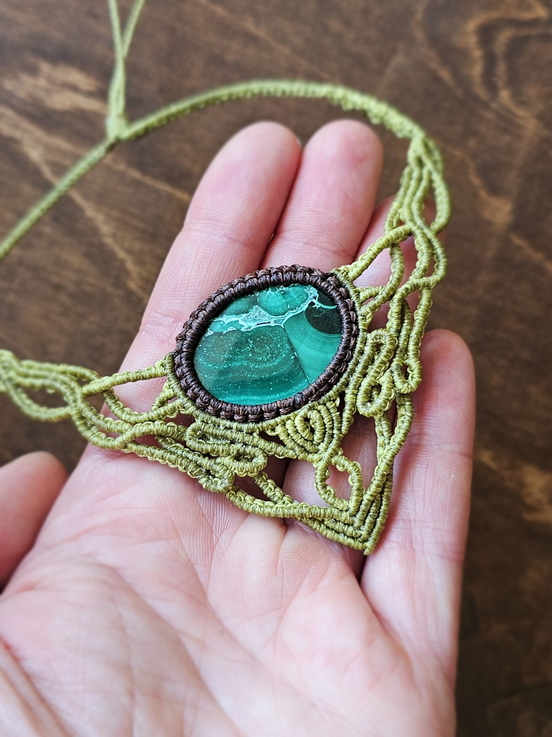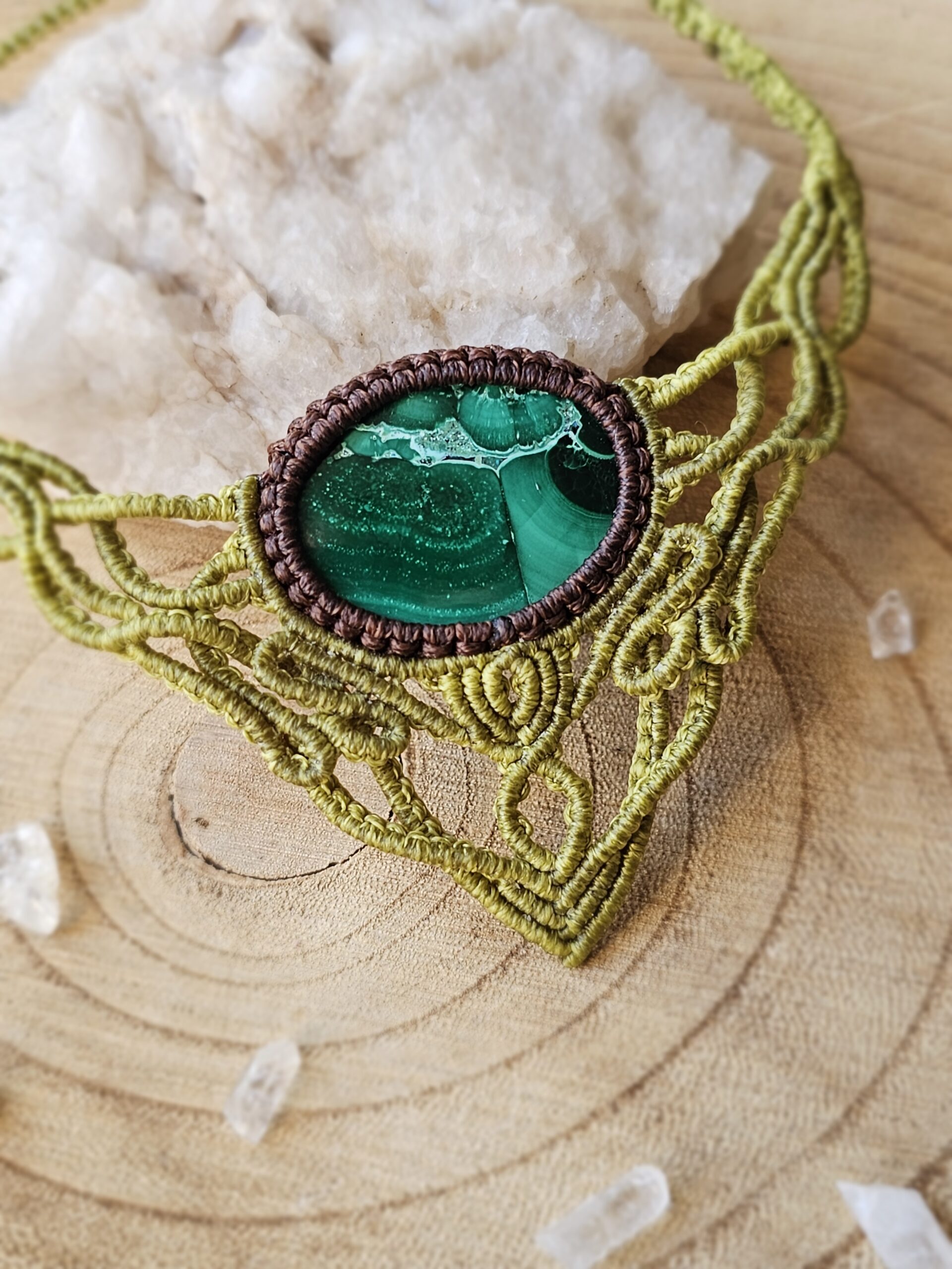 Kolia została wykonana ręcznie techniką micromacramy – precyzyjnego, czasochłonnego plecenia ze sznureczków, które tworzy subtelną, koronkową formę. W centrum kompozycji znajduje się naturalny minerał – Malachit.