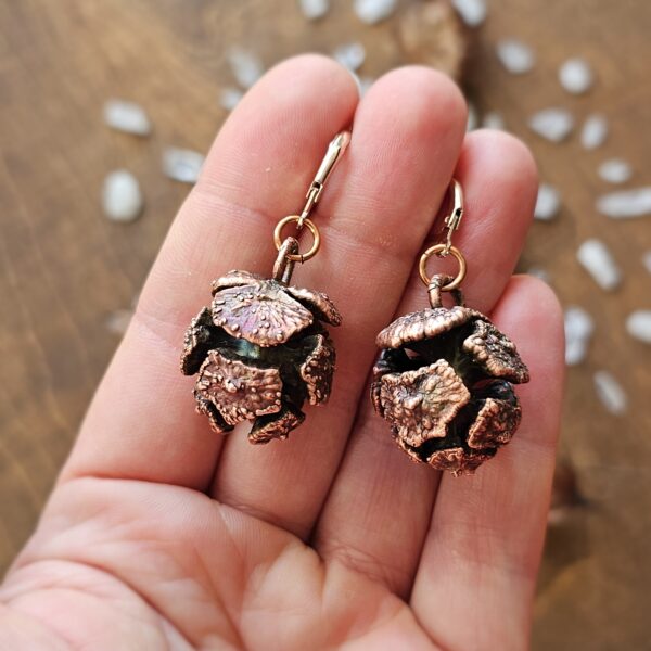 Ręcznie tworzony miedziany komplet – kolczyki oraz naszyjnik. W środku znajdują się prawdziwe szyszki, które zostały utrwalone miedzią.