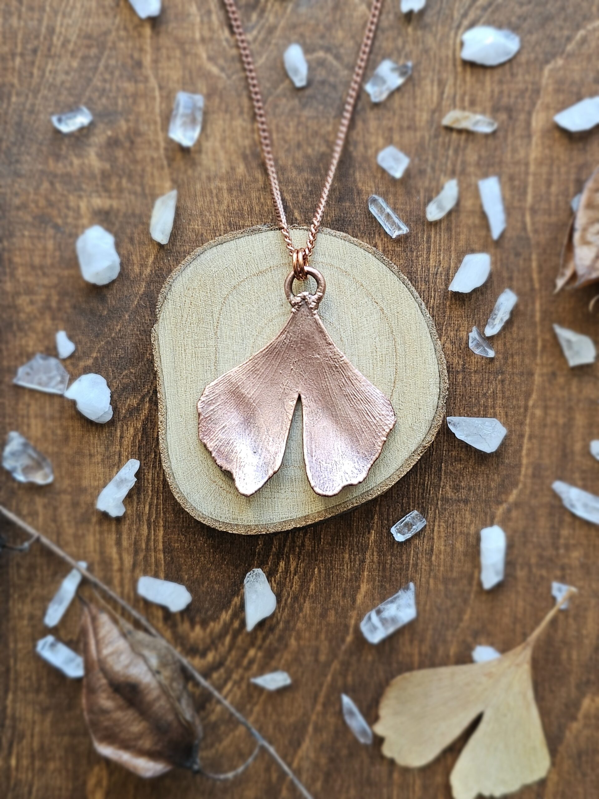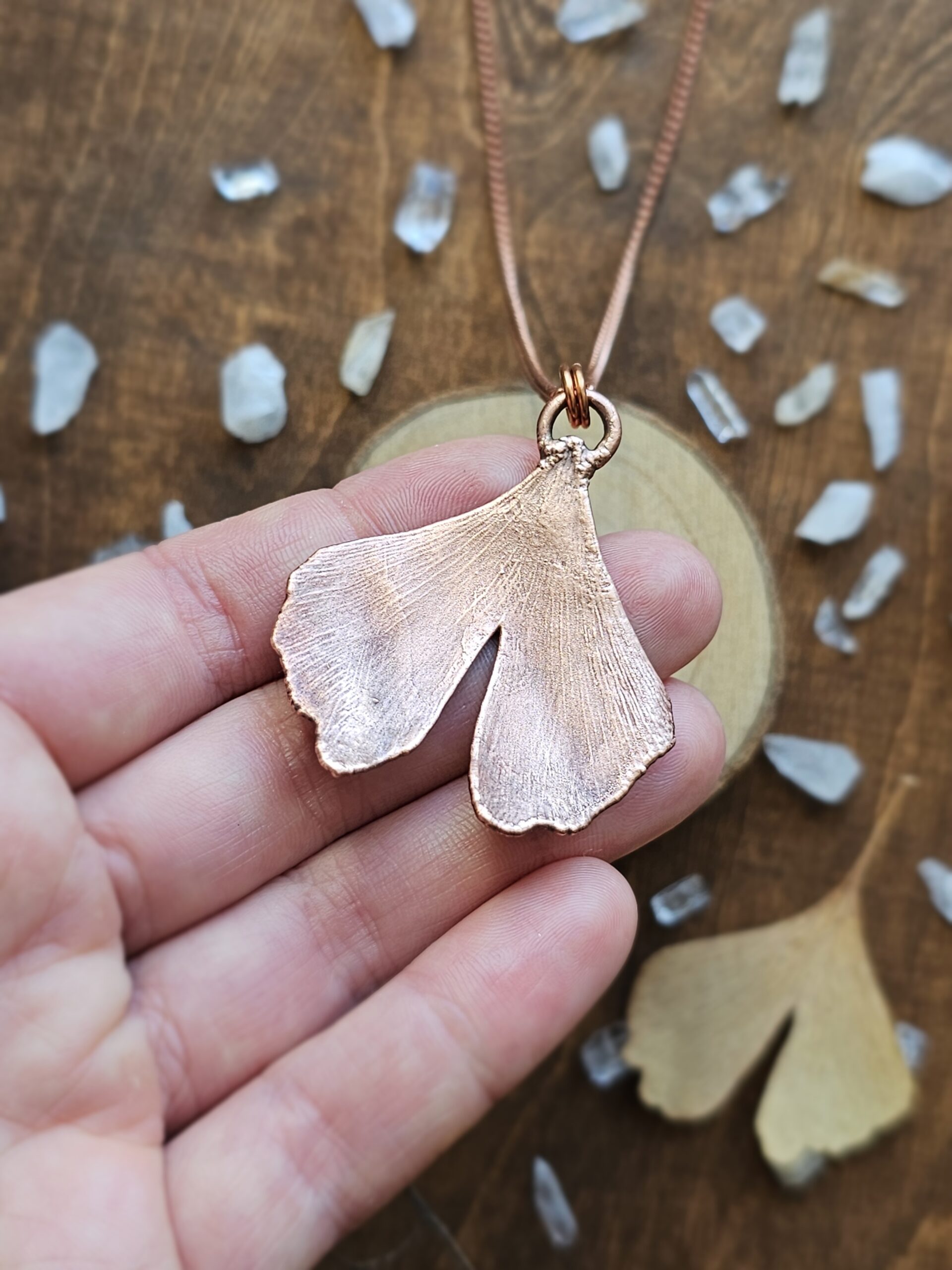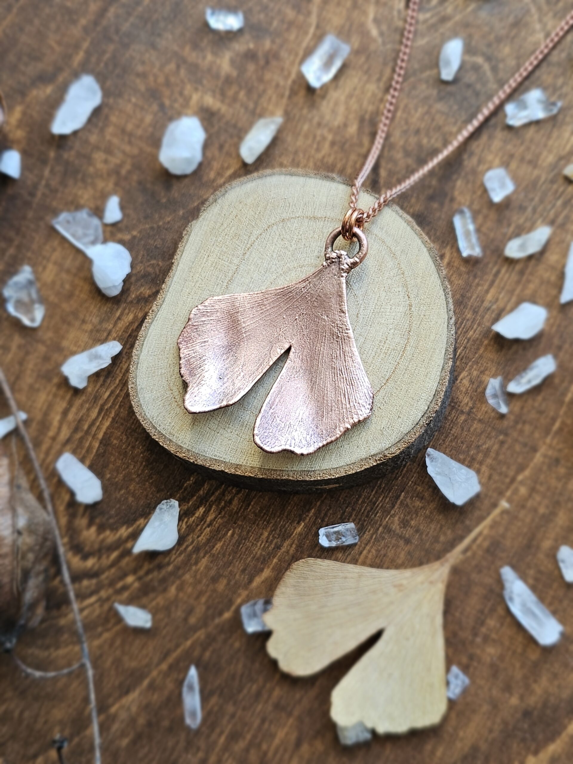 Liść miłorzębu – naturalny miedziany naszyjnik pokryty własnoręcznie czystą miedzią.