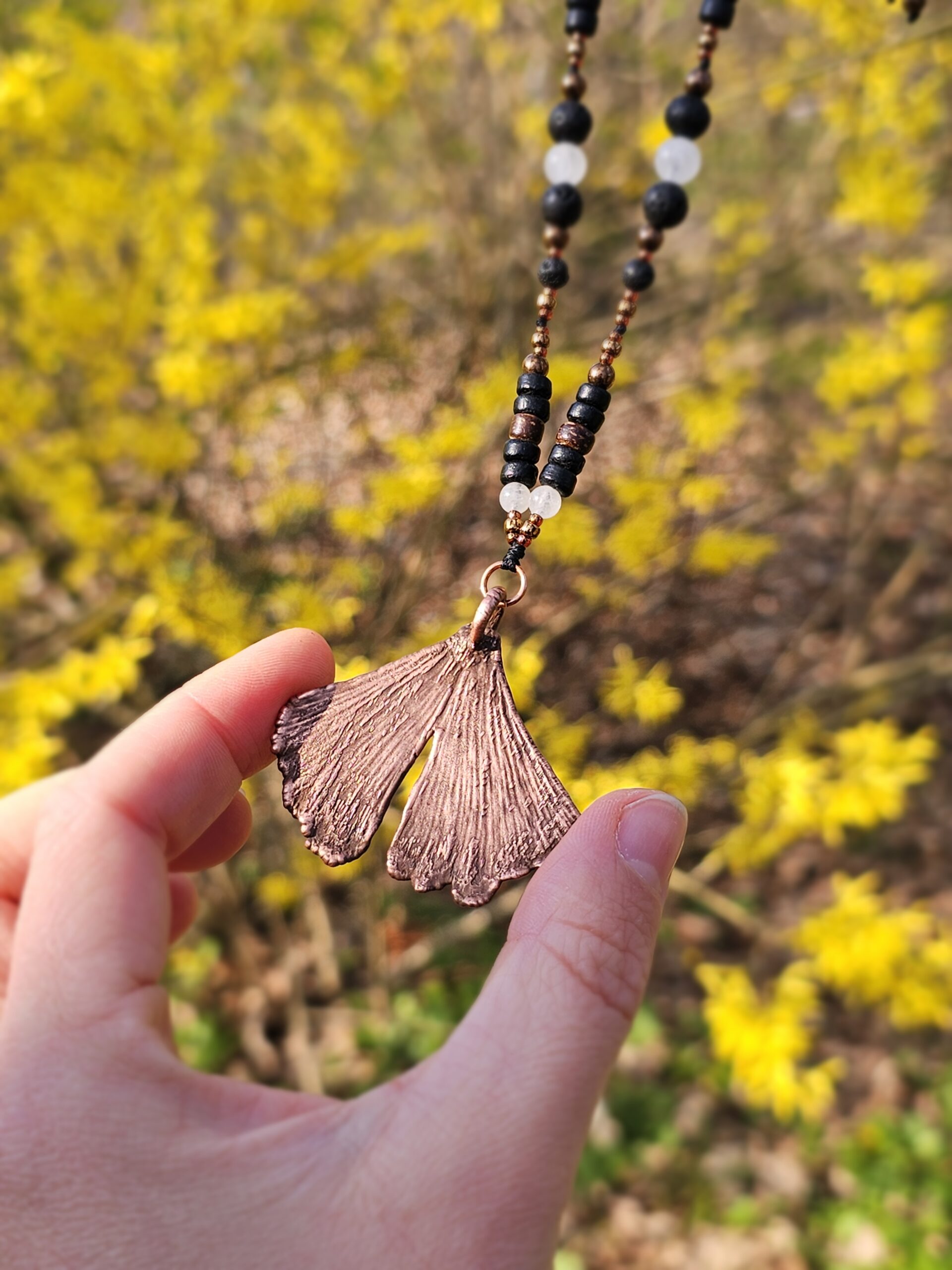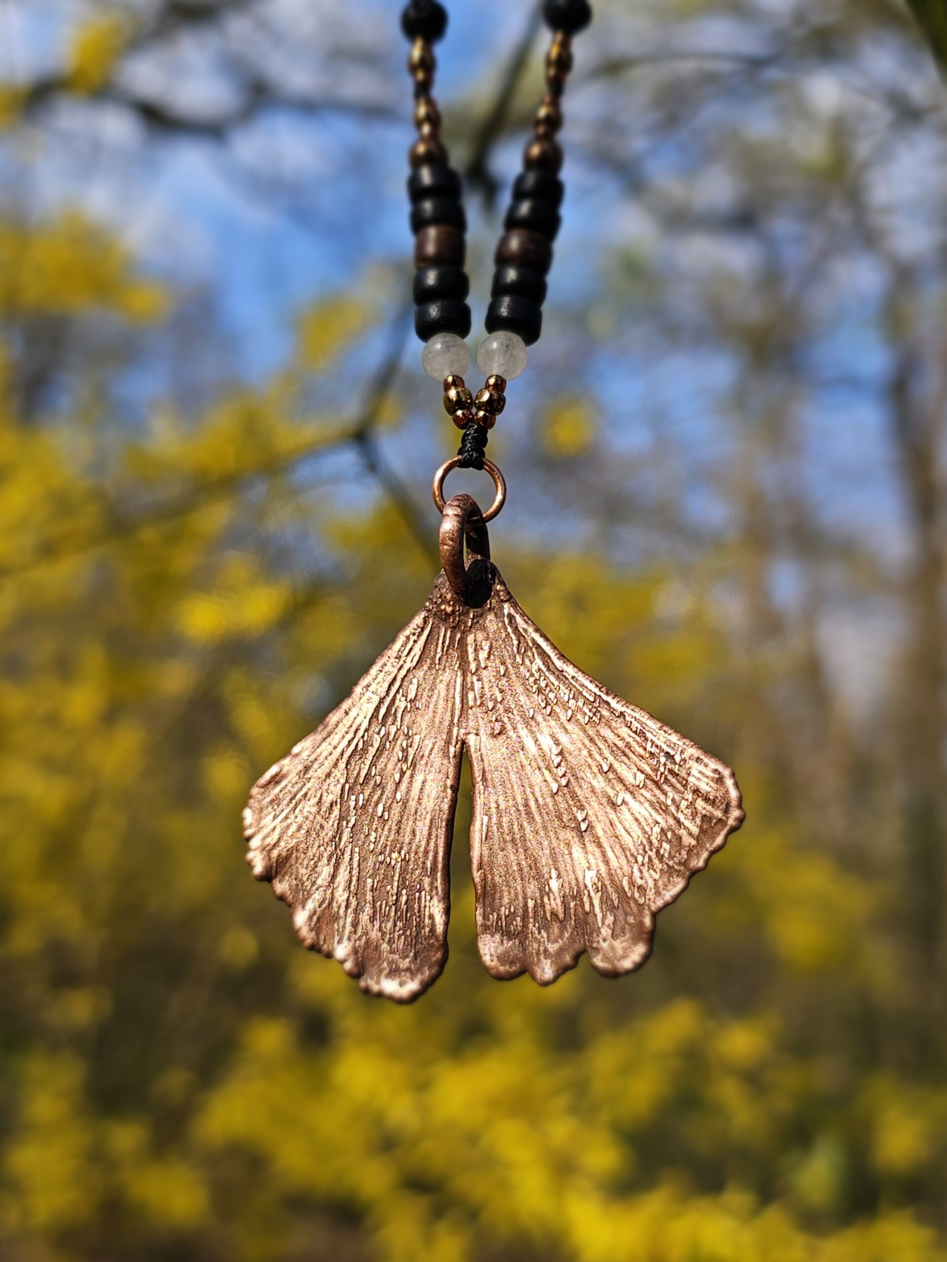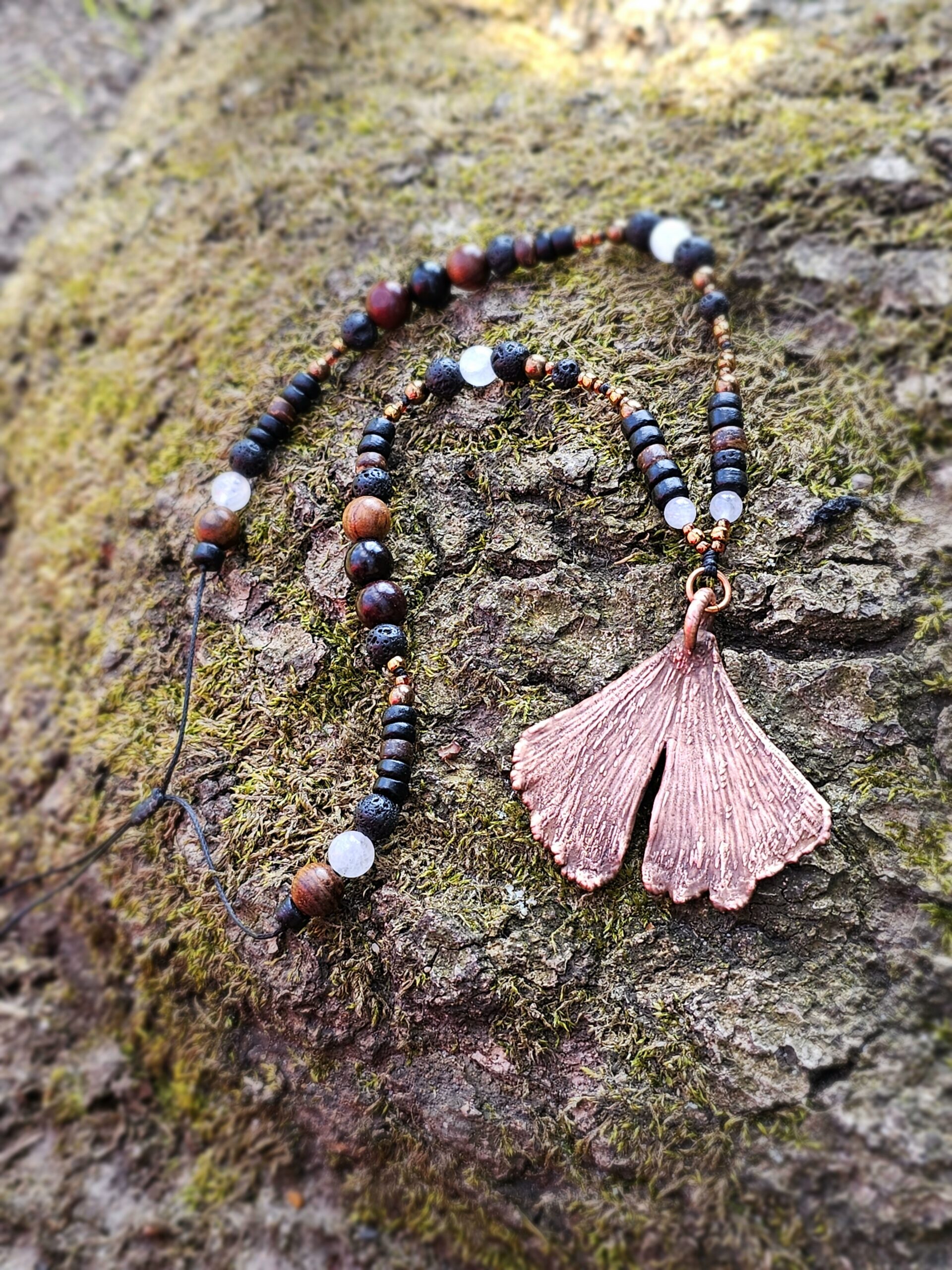 Naszyjnik został stworzony własnoręcznie czasochłonną techniką elektroformowania miedzi. W środku znajduje się prawdziwy liść miłorzębu – został on utrwalony warstwą miedzi. Dodatkiem jest minerał naturalny – labradoryt.
