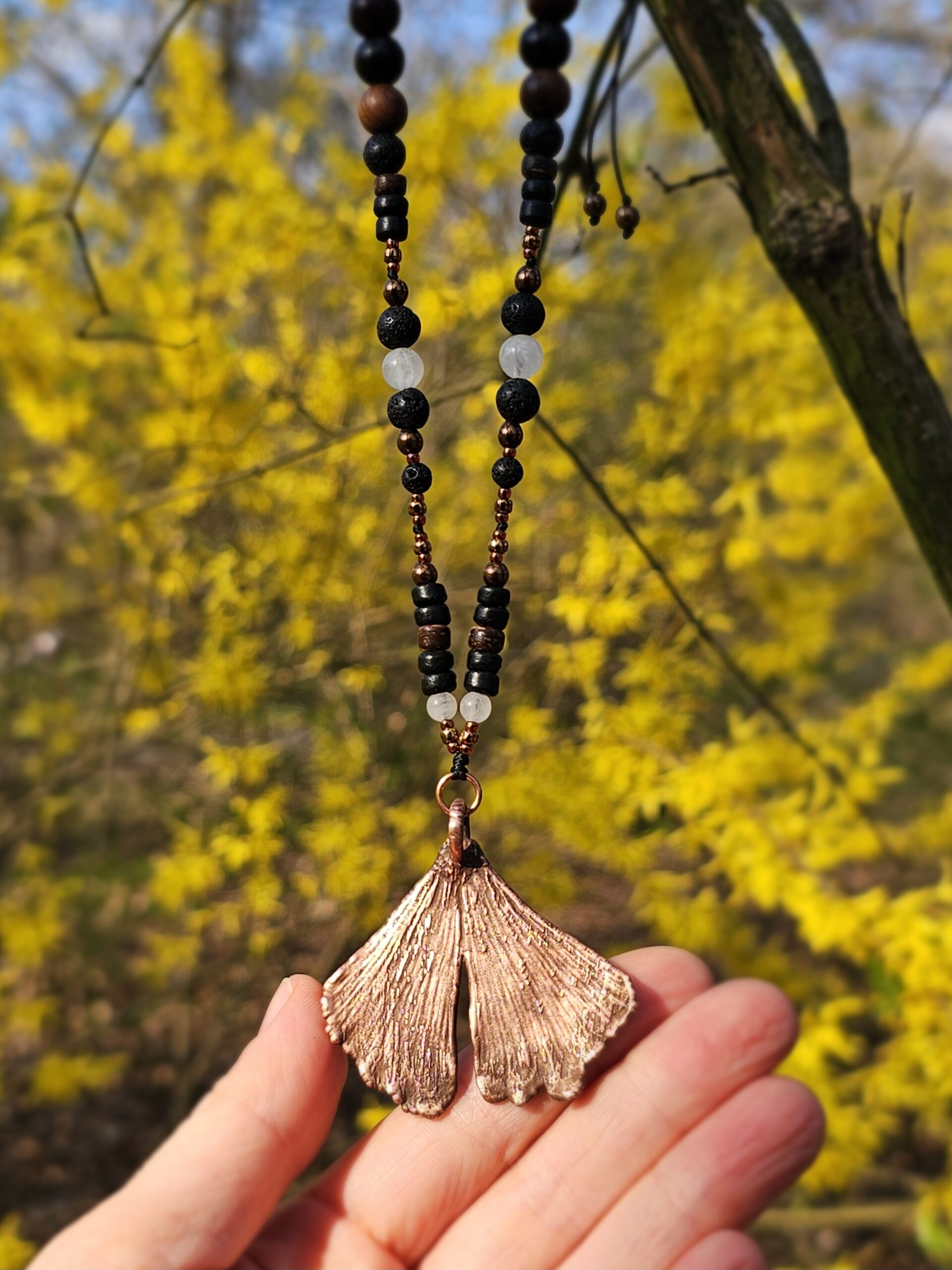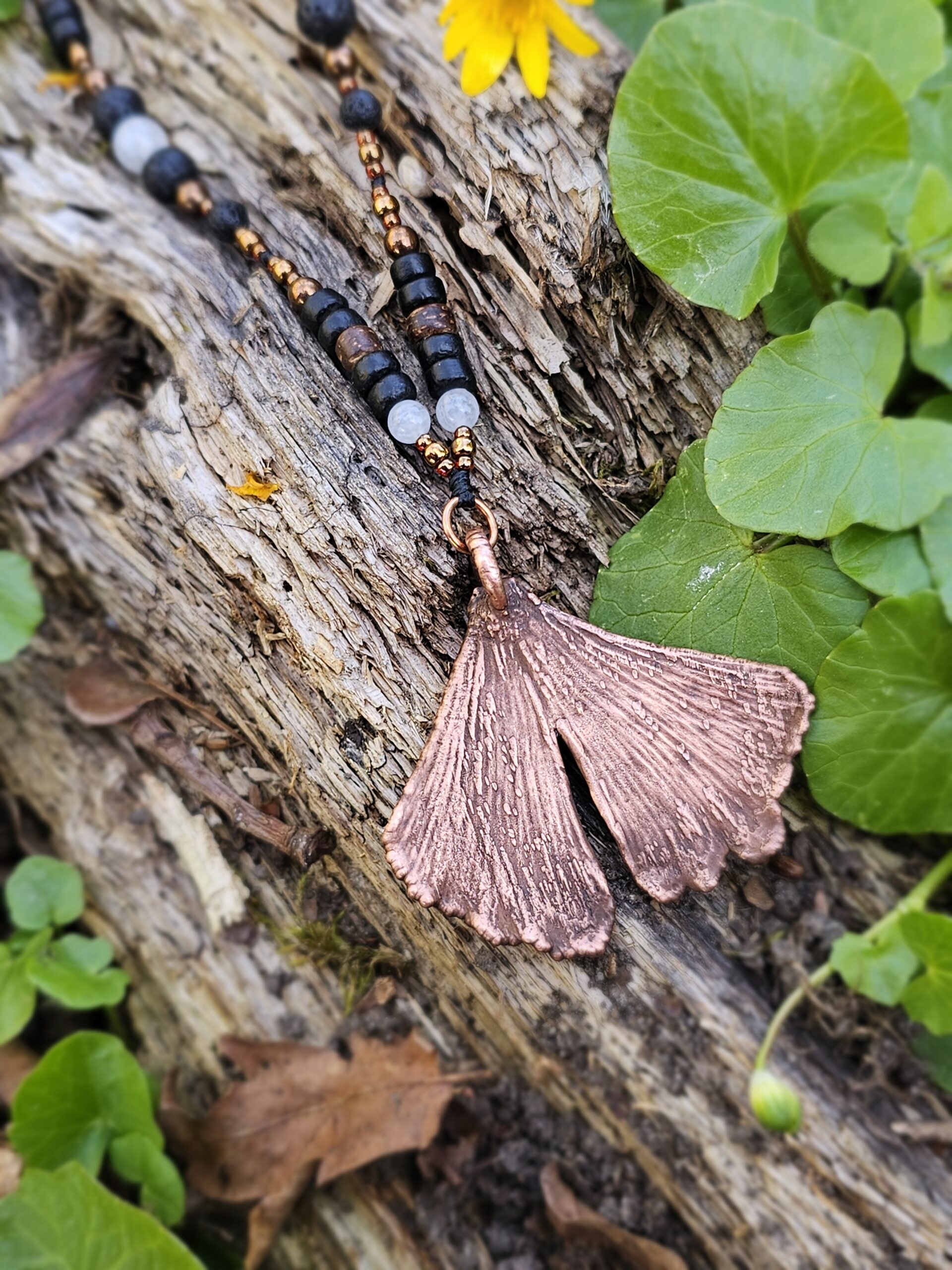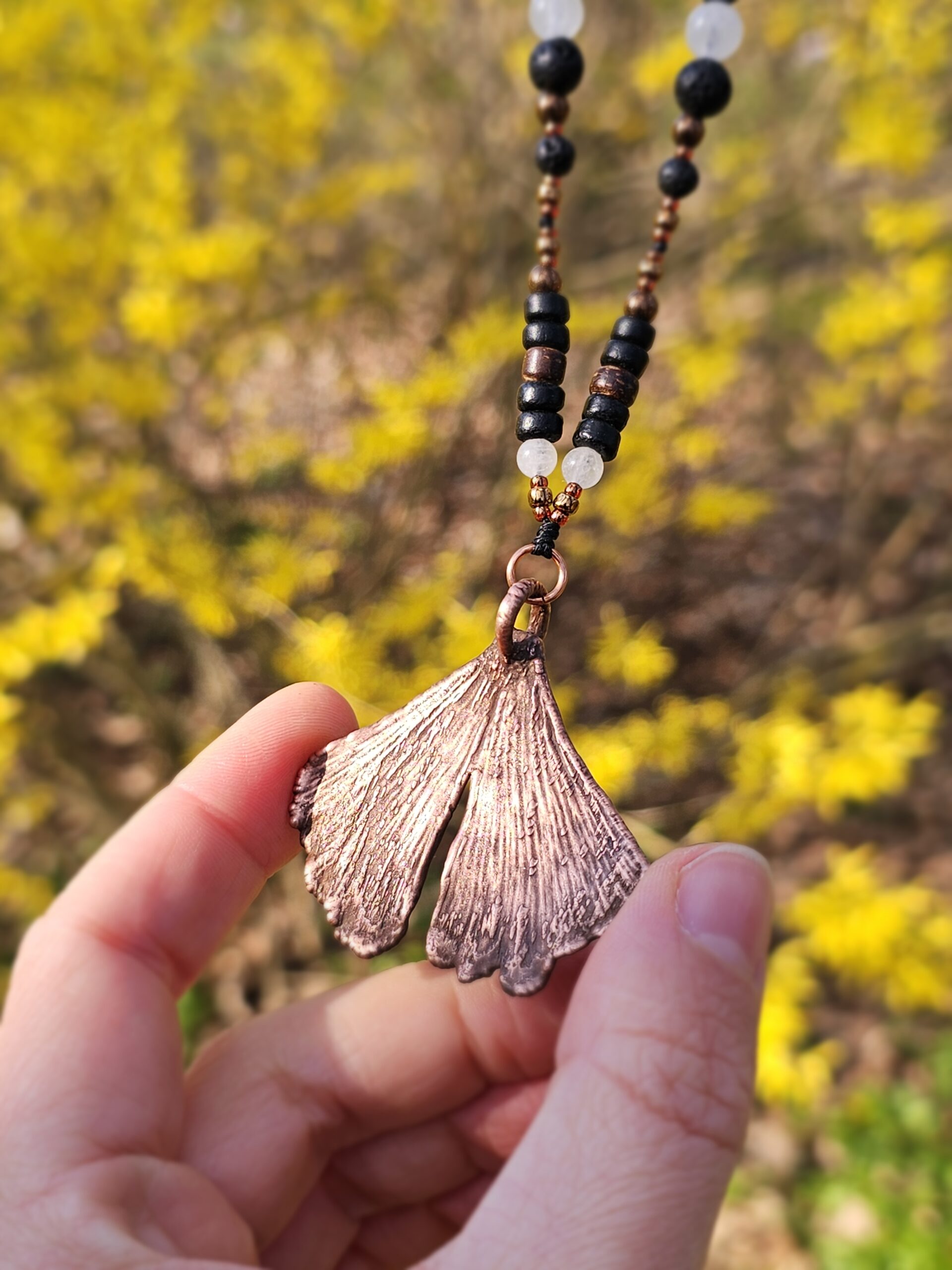 Naszyjnik został stworzony własnoręcznie czasochłonną techniką elektroformowania miedzi. W środku znajduje się prawdziwy liść miłorzębu – został on utrwalony warstwą miedzi. Dodatkiem jest minerał naturalny – labradoryt.
