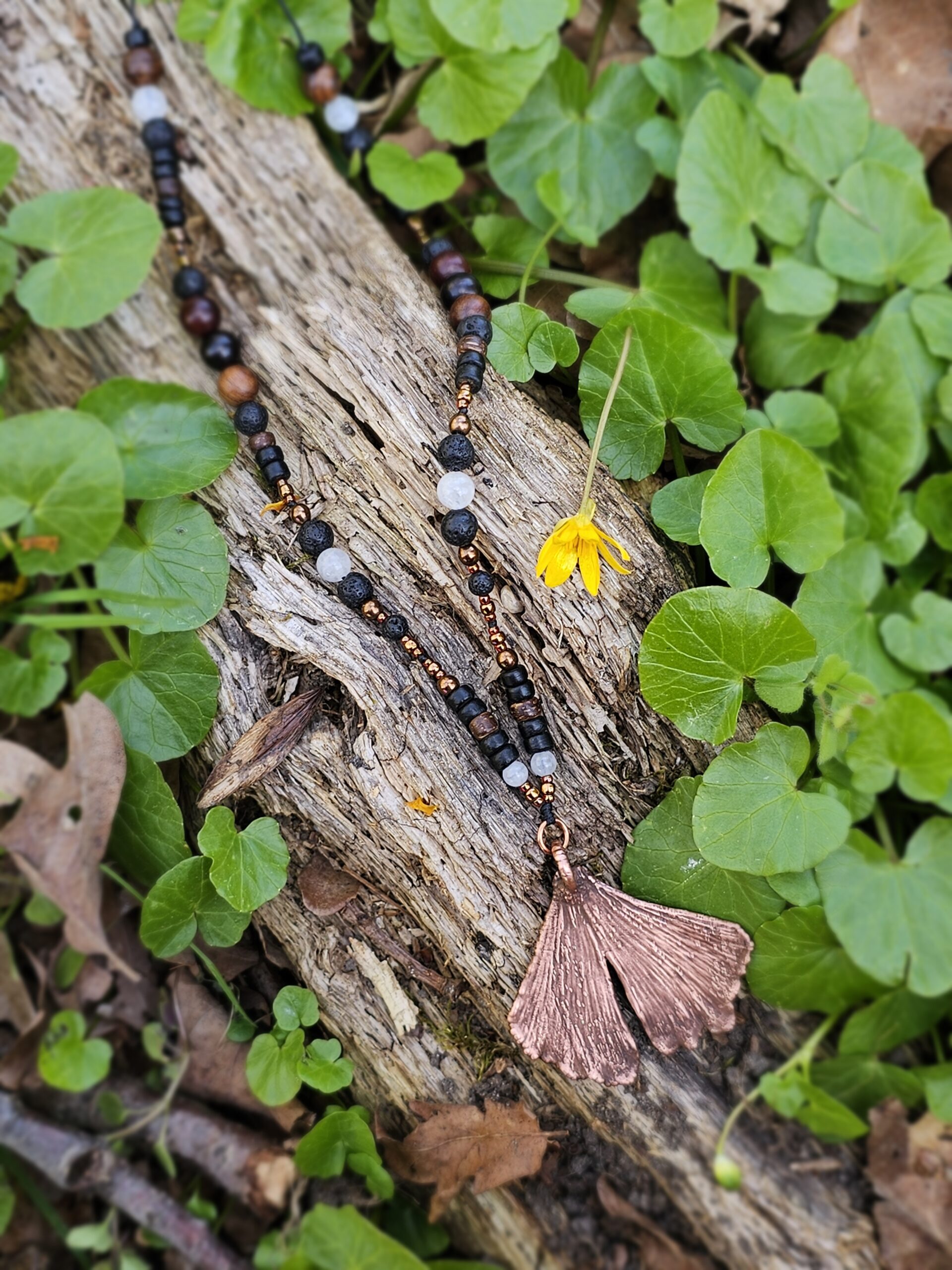 Ręcznie tworzony naszyjnik z liściem miłorzębu oraz koralikami