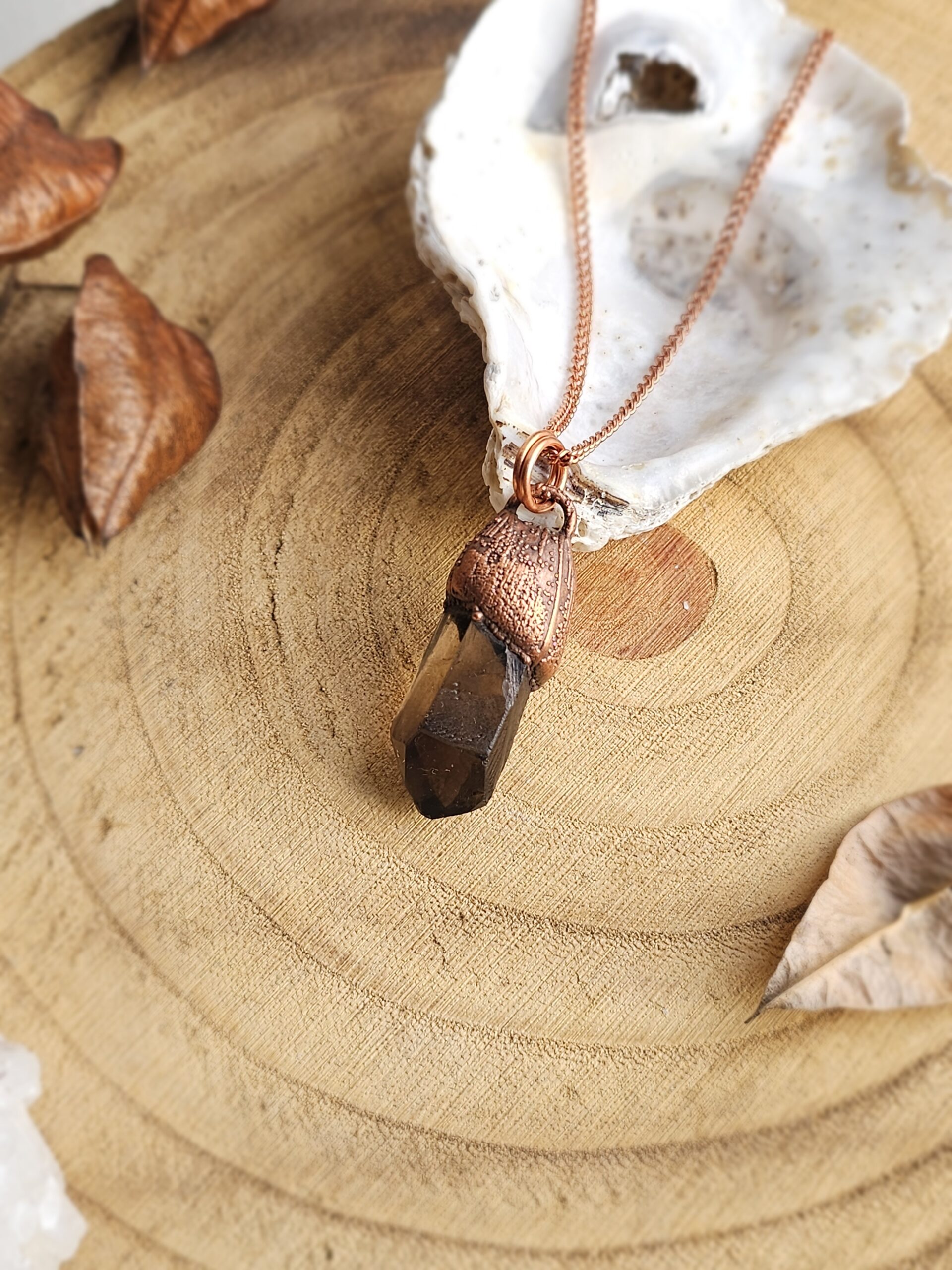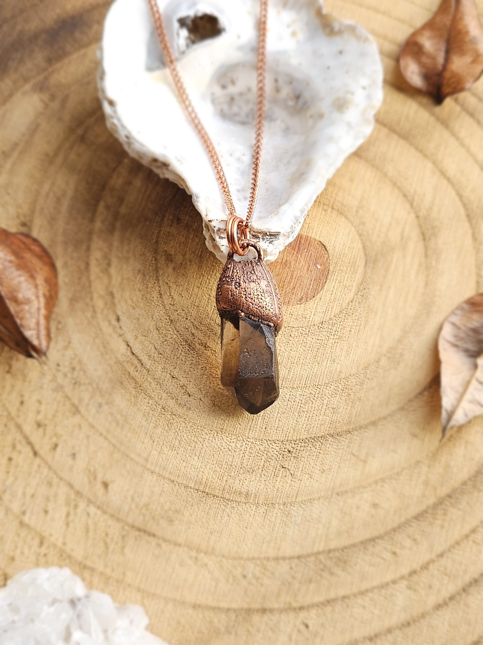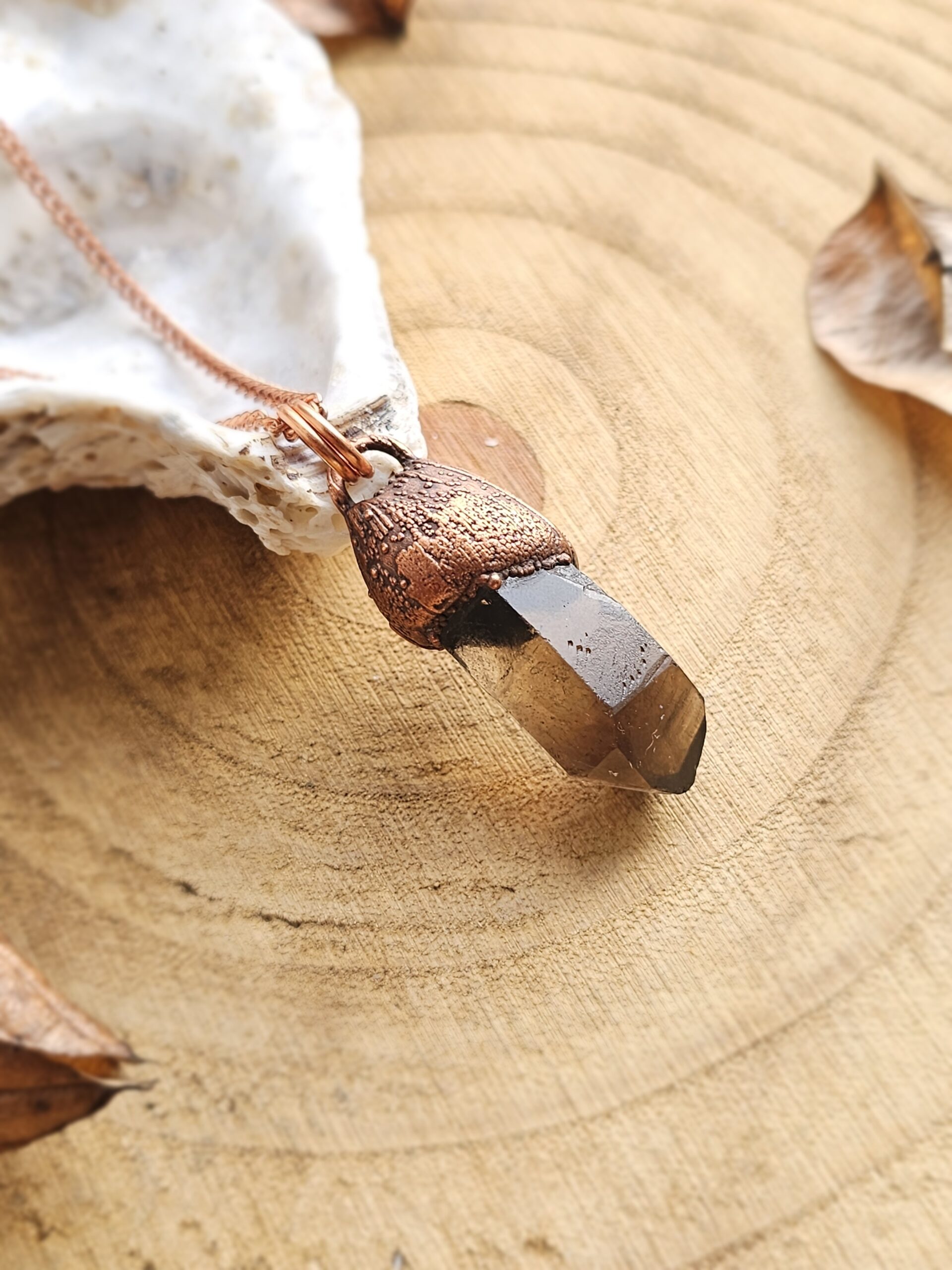 Wisiorek został stworzony własnoręcznie czasochłonną techniką elektroformowania miedzi. Użyłam naturalnego, surowego minerału – kwarcu dymnego.