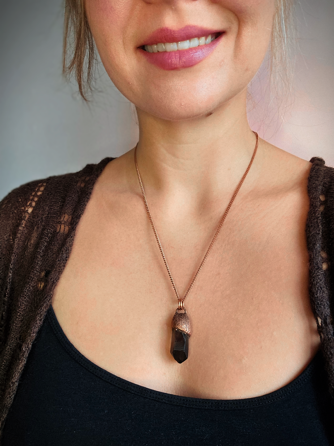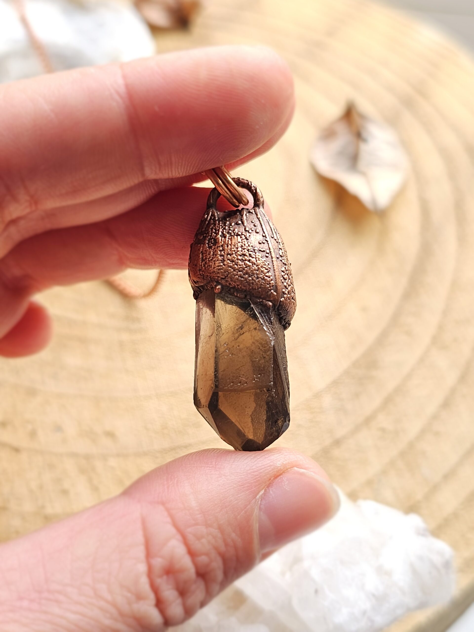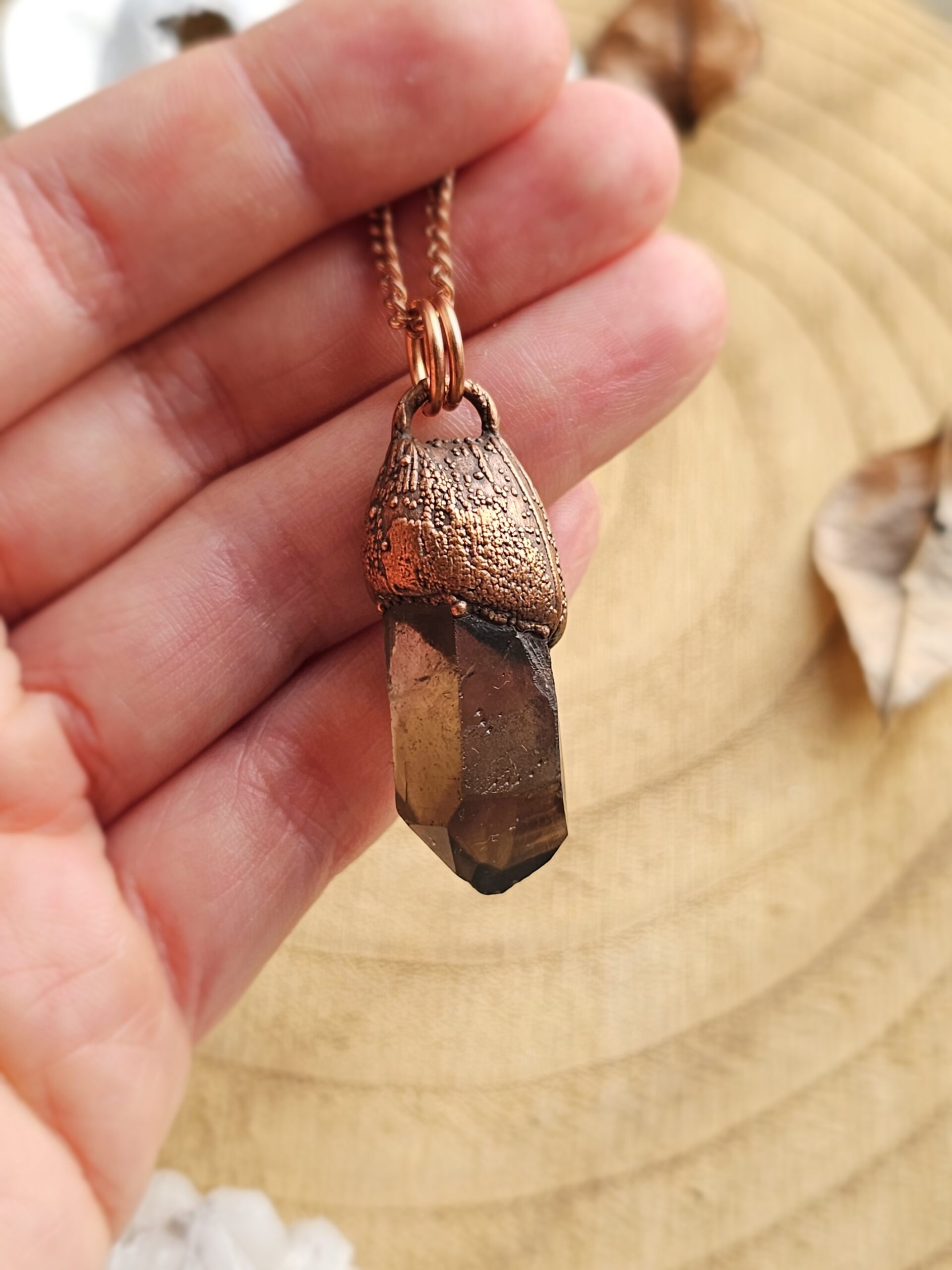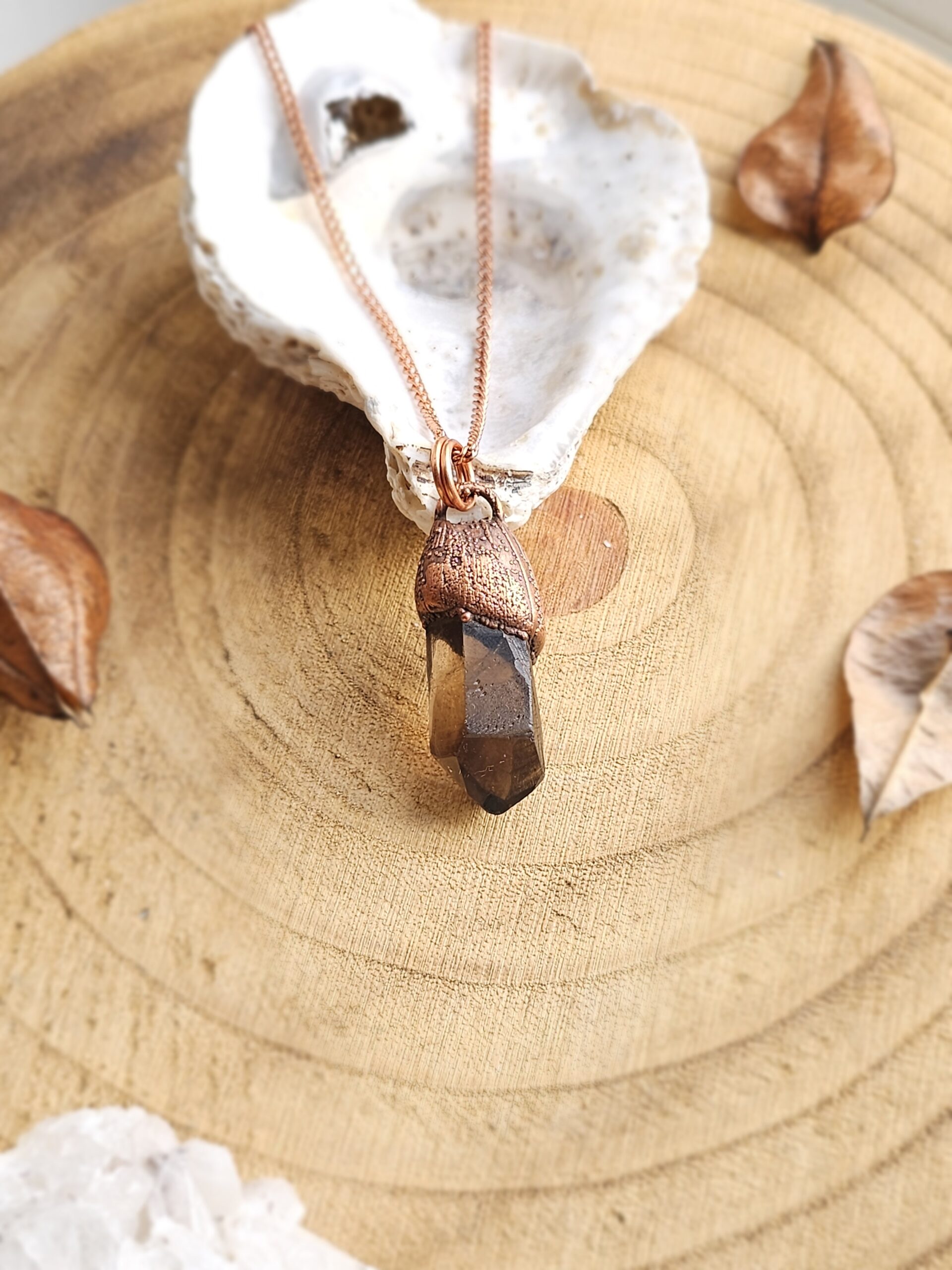 Wisiorek został stworzony własnoręcznie czasochłonną techniką elektroformowania miedzi. Użyłam naturalnego, surowego minerału – kwarcu dymnego.