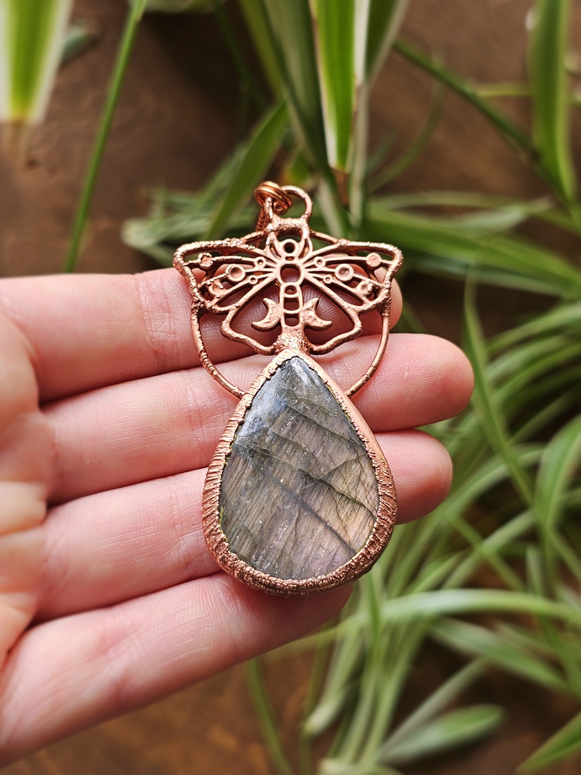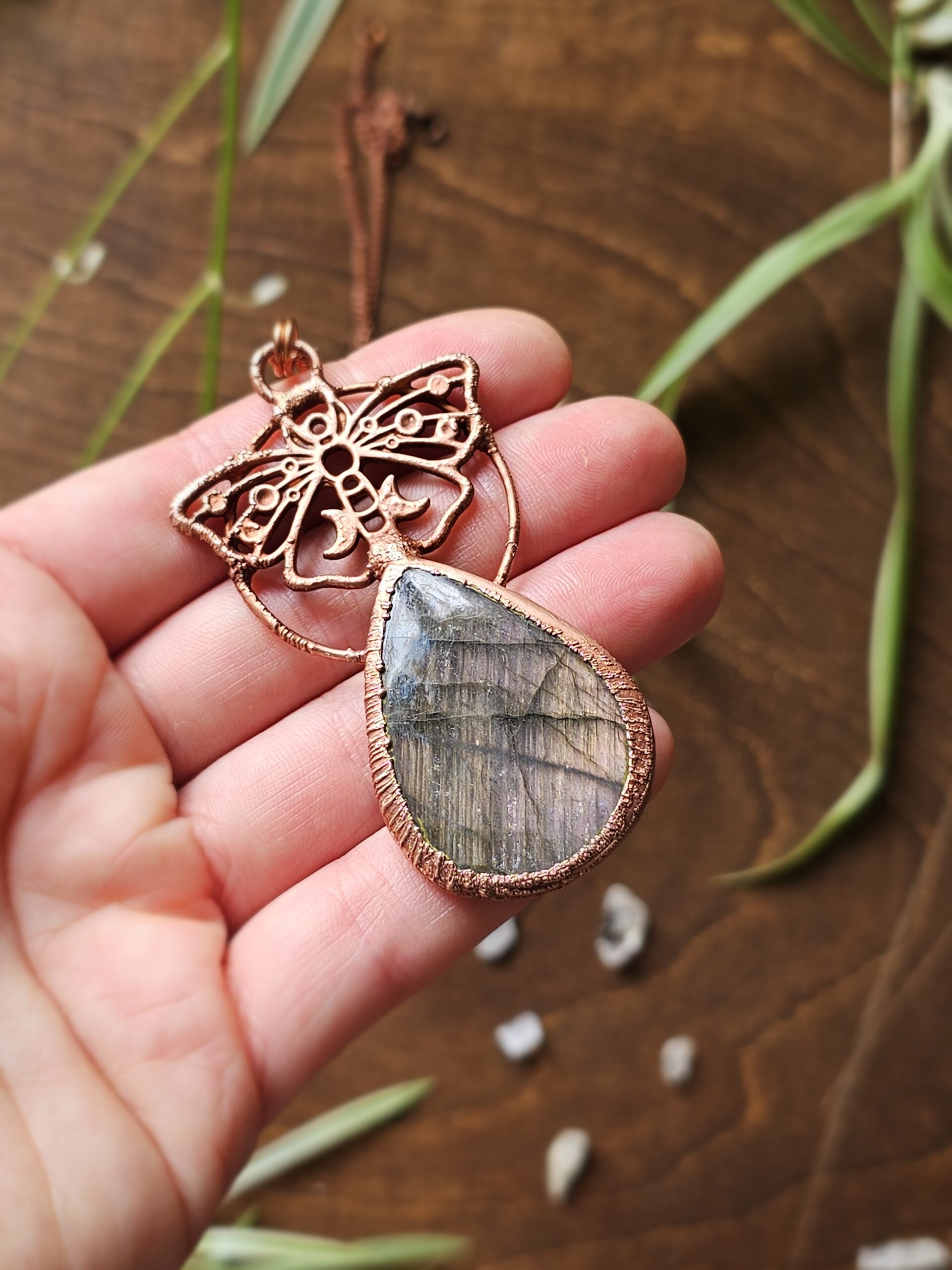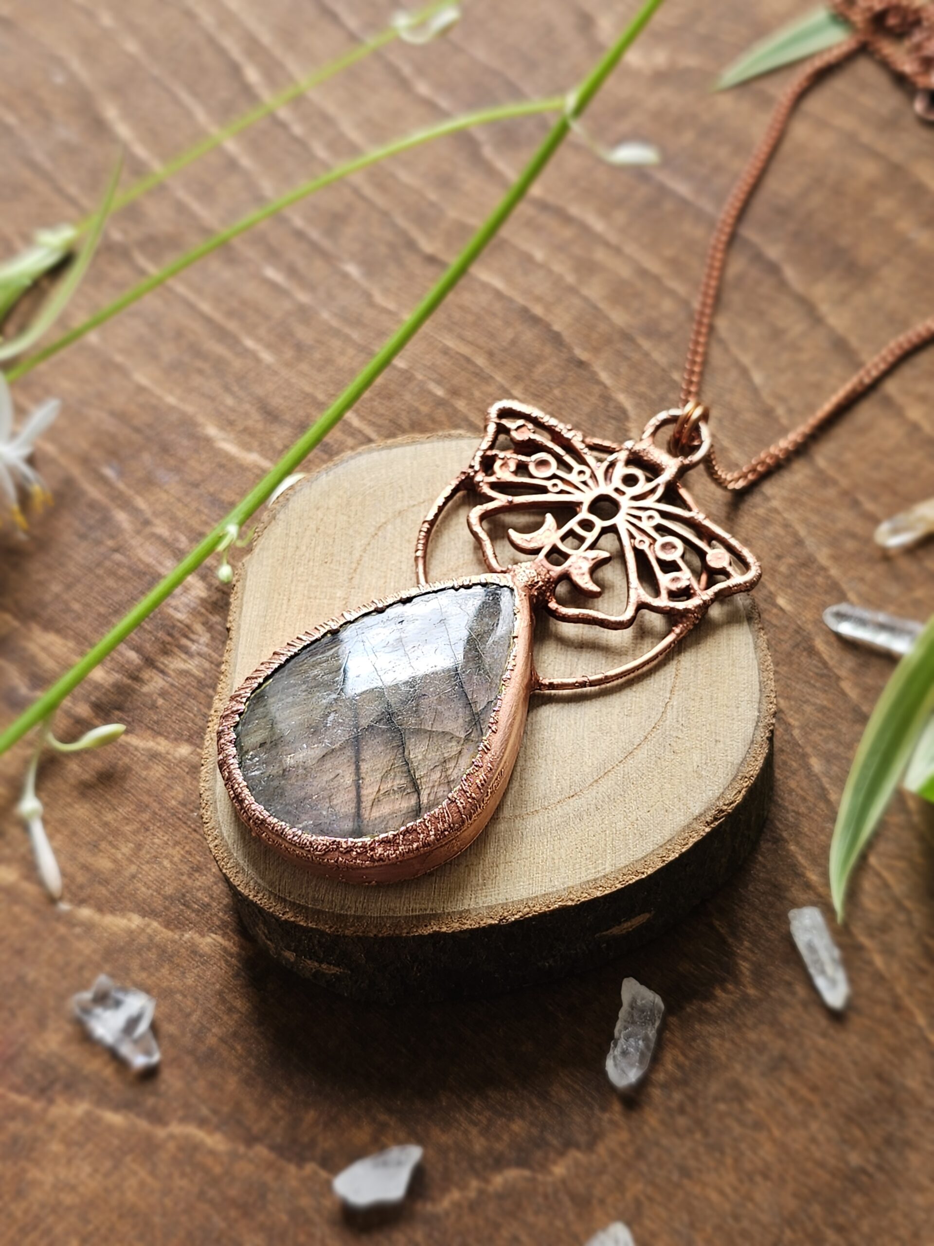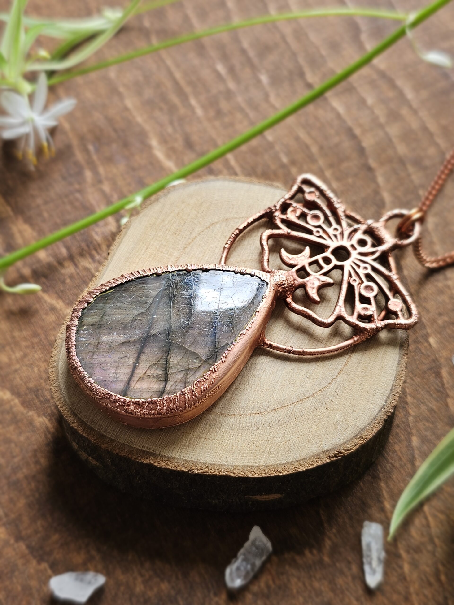 Ręcznie tworzony naszyjnik – labradoryt z motywem motyla. Całość oprawiona własnoręcznie czystą miedzią.