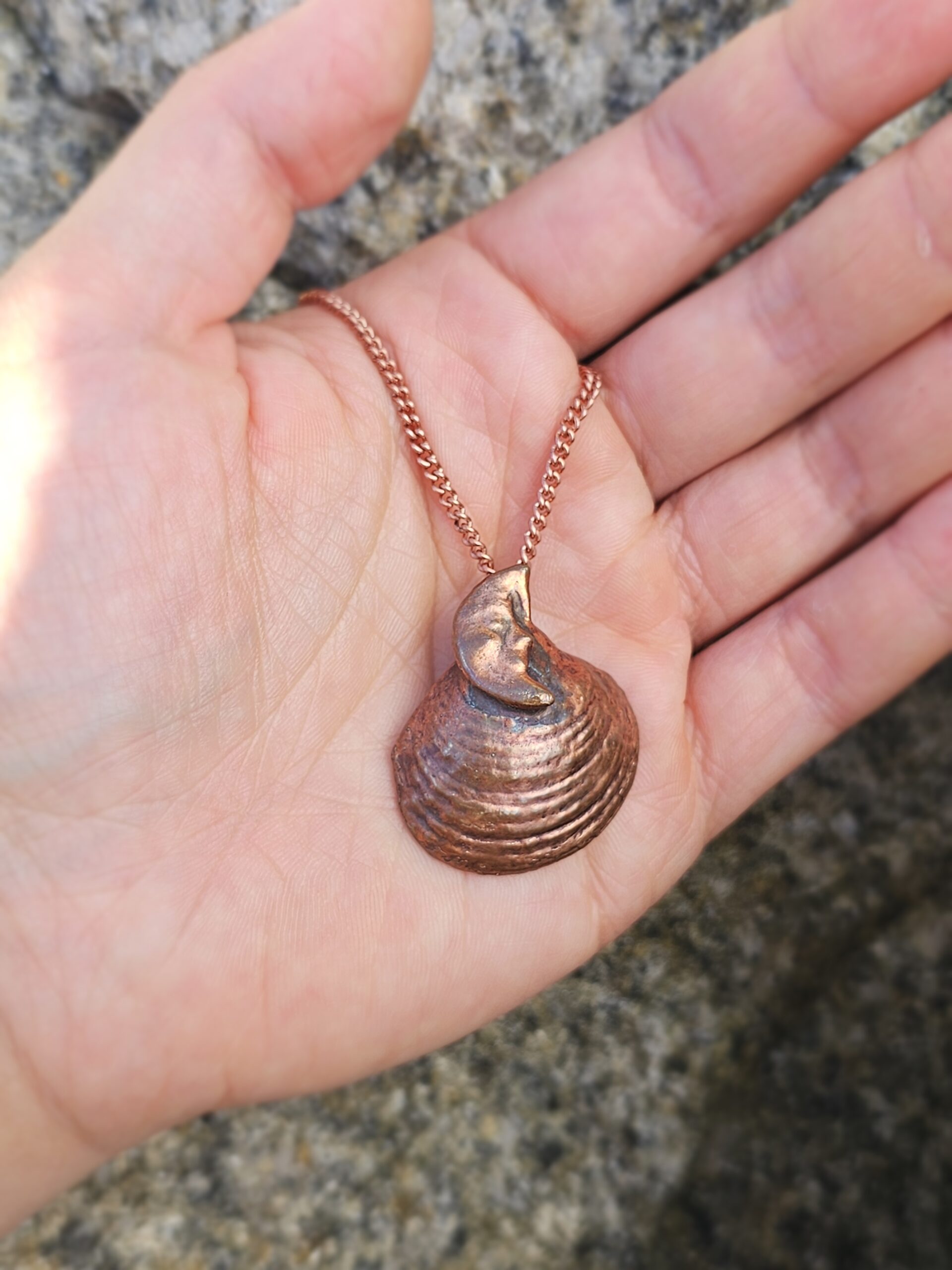 Prawdziwa muszla, zamknięta w miedzi niczym echo oceanu. Symbol podróży, wolności i głosu serca – przypomina o falach, które nieustannie wracają do brzegu. Ten naszyjnik niesie w sobie szum morza i wspomnienie odległych, letnich dni.