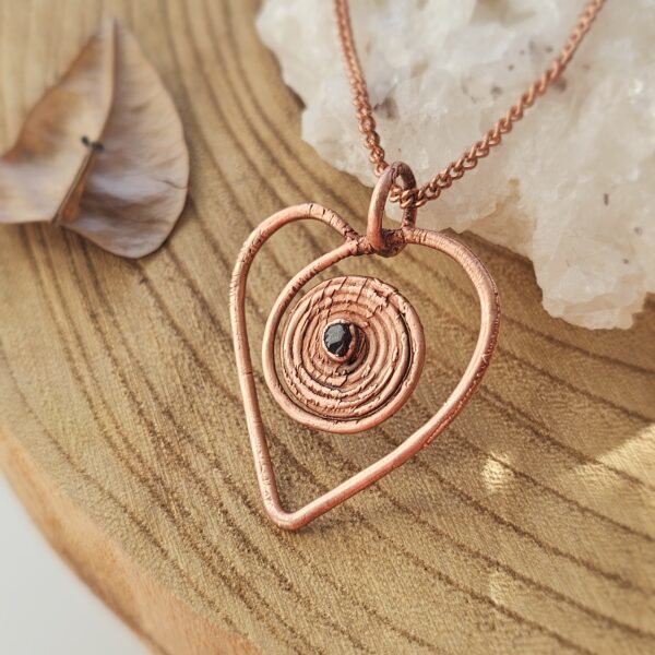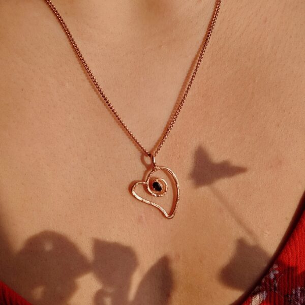 Ręcznie tworzony amulet – naszyjnik serce z granatem. Całość oprawiona własnoręcznie czystą miedzią.