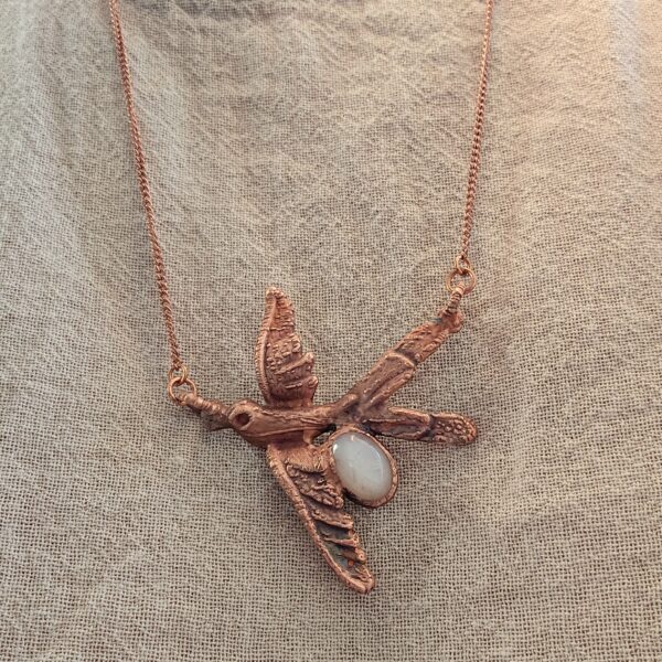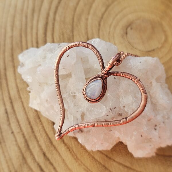 Ręcznie tworzony amulet – naszyjnik serce z kamieniem księżycowym. Całość oprawiona własnoręcznie czystą miedzią.