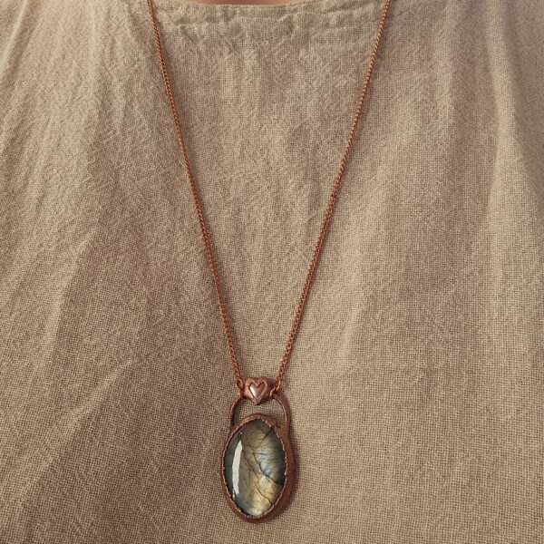 Ręcznie tworzony amulet – naszyjnik z labradorytem. Całość oprawiona własnoręcznie czystą miedzią.