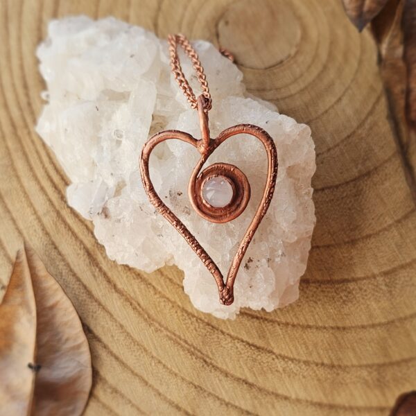 Ręcznie tworzony amulet – naszyjnik serce z kwarcem różowym. Całość oprawiona własnoręcznie czystą miedzią.