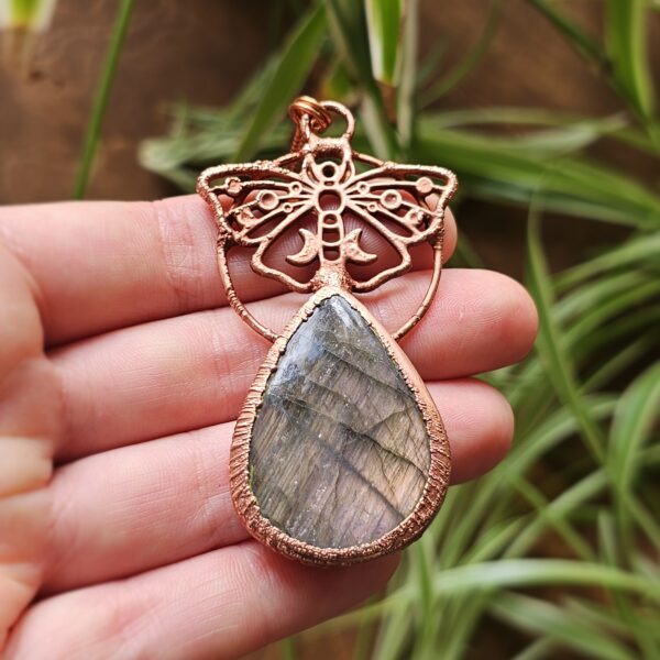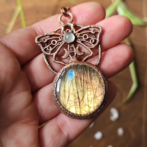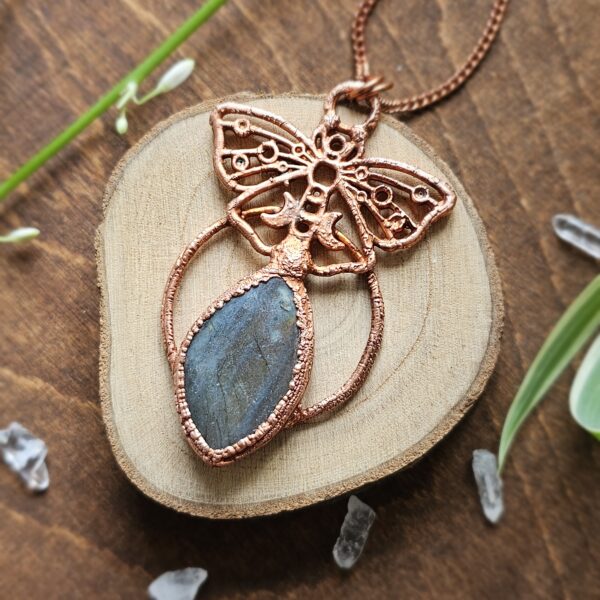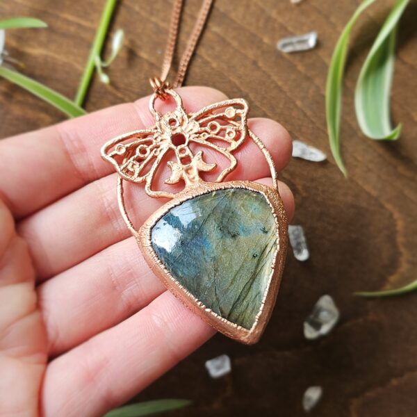 Ręcznie tworzony naszyjnik – labradoryt z motywem motyla. Całość oprawiona własnoręcznie czystą miedzią.