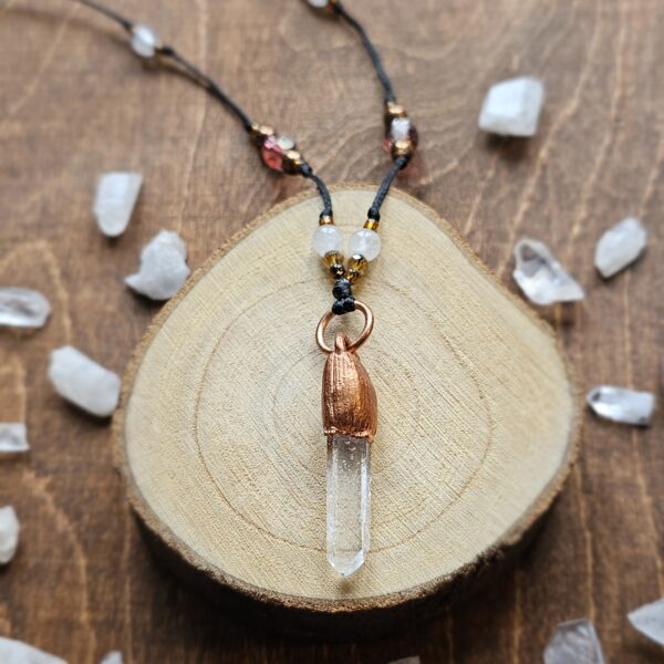 Ręcznie tworzony naszyjnik – kryształ górski z koralikami . Całość oprawiona własnoręcznie czystą miedzią.