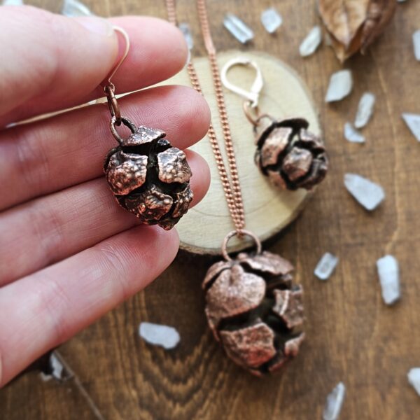 249,00 złRęcznie tworzony miedziany komplet – kolczyki oraz naszyjnik. W środku znajdują się prawdziwe szyszki, które zostały utrwalone miedzią.